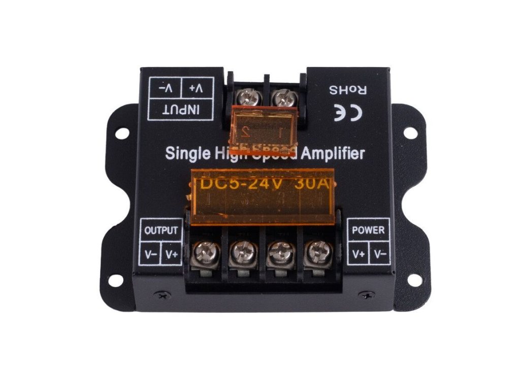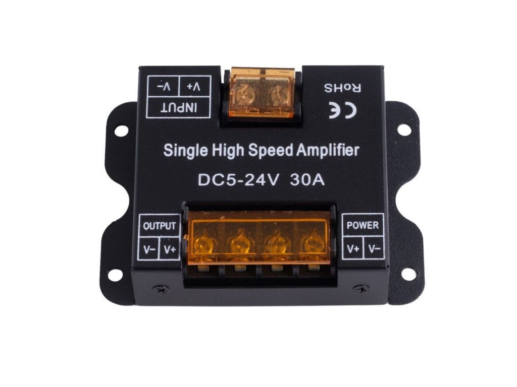 Egycsatornás jelerősítő egyszínű LED termékekhez, például LED szalagokhoz vagy LED modulokhoz. A LED vezérlők teljesítményének megengedett terhelést meghaladó bővítésére szolgál.