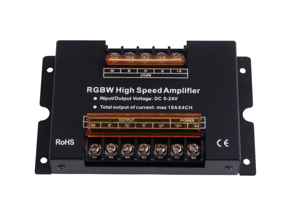 Négyszínű RGBW jelű RGBW LED termékek erősítője. A LED vezérlők teljesítményének megengedett terhelést meghaladó bővítésére szolgál.