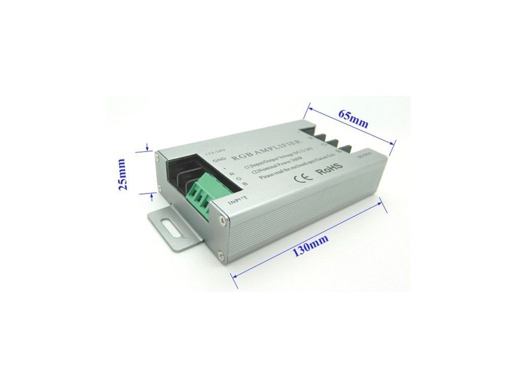 Háromcsatornás RGB jelerősítő RGB LED szalagokhoz és modulokhoz. A LED-meghajtók teljesítményének a megengedett terhelésen túli kiterjesztésére szolgál. (Például egy 72 W maximális terhelésű meghajtóhoz csatlakoztasson egy erősítőt, hogy egy további 360 W-os szakaszt adjon hozzá. Vegye figyelembe, hogy az értékek nem adódnak össze. Az erősítőre csak a javasolt terhelést lehet rákapcsolni.
