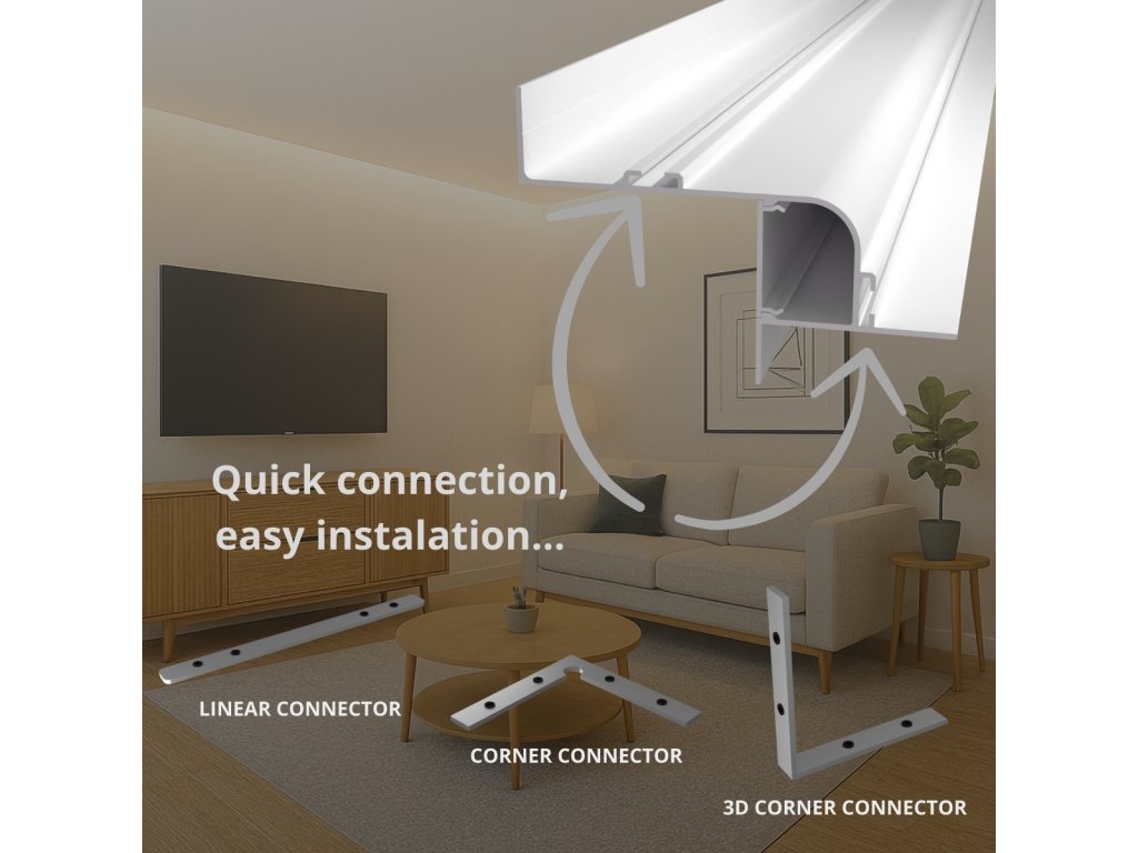 A profil a helyiségek kerülete mentén történő összefüggő, közvetett világítás létrehozására szolgál, ahol a fény finoman keretezi a teret és optikailag növeli azt. Ideális a fal és a gipszkarton mennyezet közötti átmenet kiemelésére, ahol elegáns világítási vonalat hoz létre látható lámpatestek nélkül. Különösen alkalmas lakóterekbe, mint például nappalik, hálószobák vagy előszobák, de szállodákba, irodákba, bemutatótermekbe és más reprezentatív kereskedelmi helyiségekbe is, ahol az építészeti részletekre és az időtlen megjelenésre helyezik a hangsúlyt.