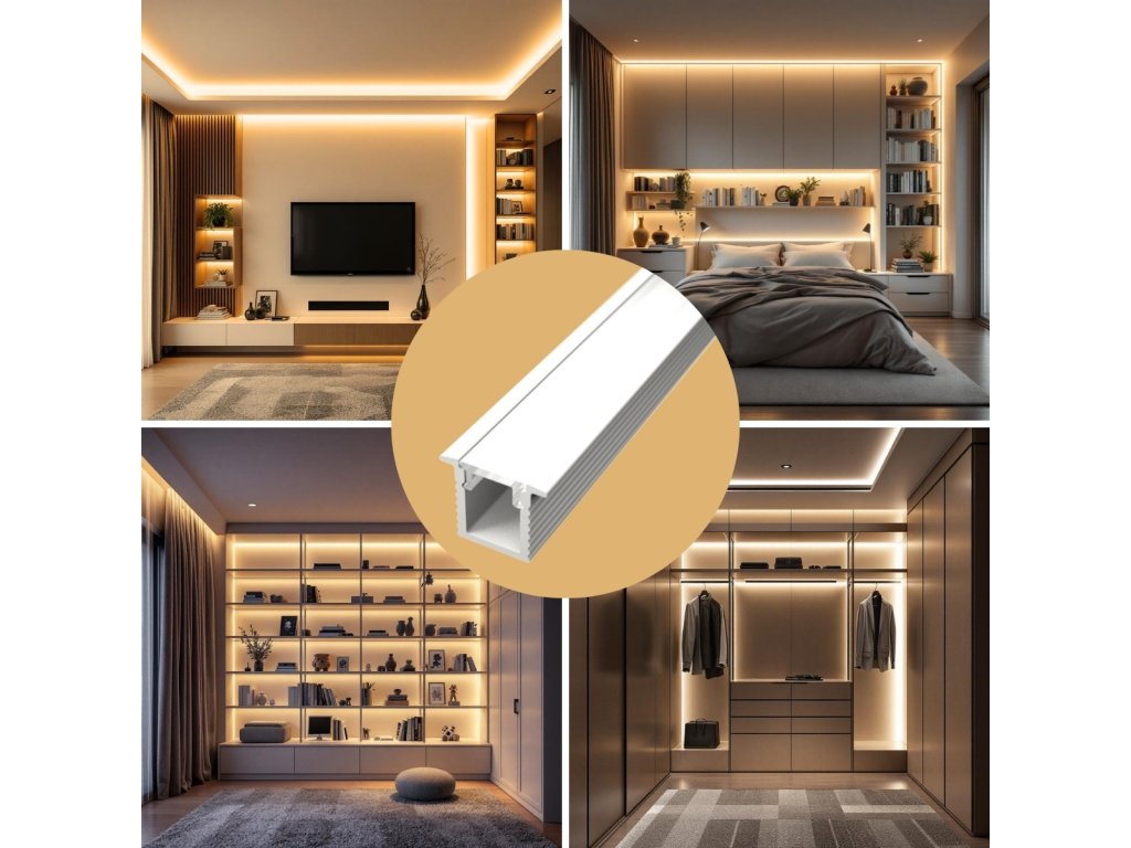 Ez a SLIM beépíthető alumínium profil vagy léc nemcsak hűtőborda a LED szalagokhoz, hanem design elemként is szolgál otthonában, vagy bútor kiegészítőként. Kompakt méretének köszönhetően a profil max. 5 mm széles LED szalagokhoz készült. Kizárólag süllyesztett szerelésre tervezték, és alkalmas faanyagokba, bútorelemekbe, polcokba, fiókokba, dekoratív panelekbe vagy 3D falpanelekbe való integrálásra, ahol nagyon feltűnésmentesen és elegánsan hat.