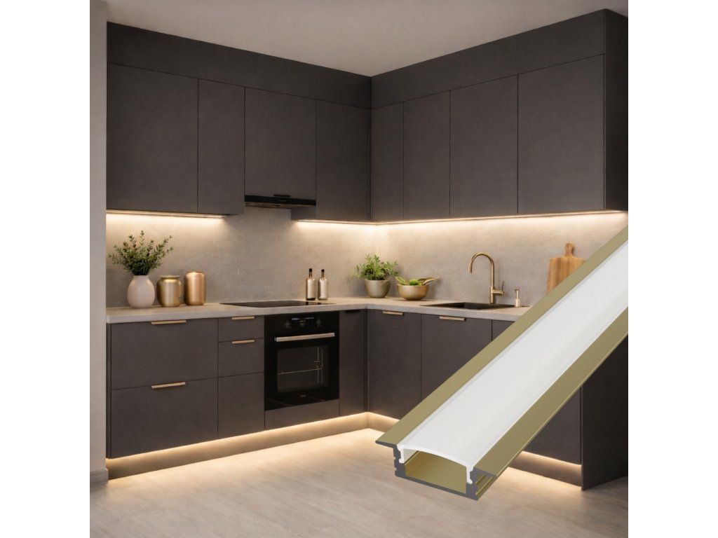 A pezsgőszínű, elegáns alumínium süllyesztett profil LED szalag hűtőjeként és dizájnelemként szolgál, amely modern és luxus kivitelű belső terekbe illik. A finom fémes árnyalat letisztultnak és időtállónak tűnik, és jól illeszkedik világos anyagokhoz, üveghez vagy fém részletekhez.