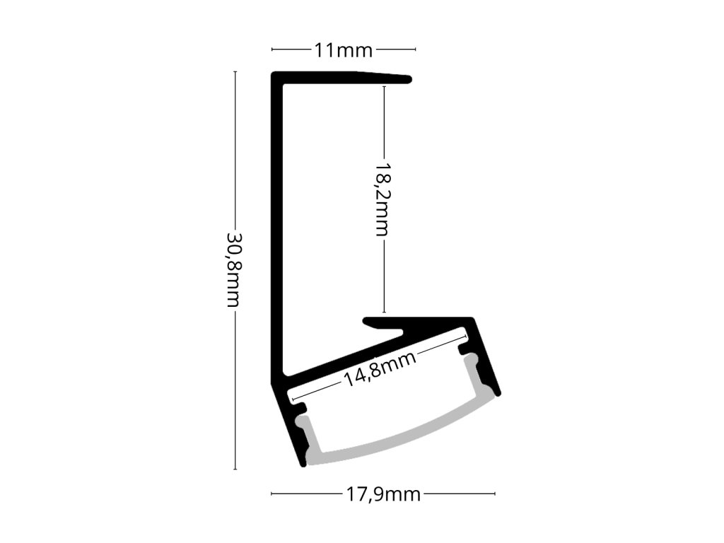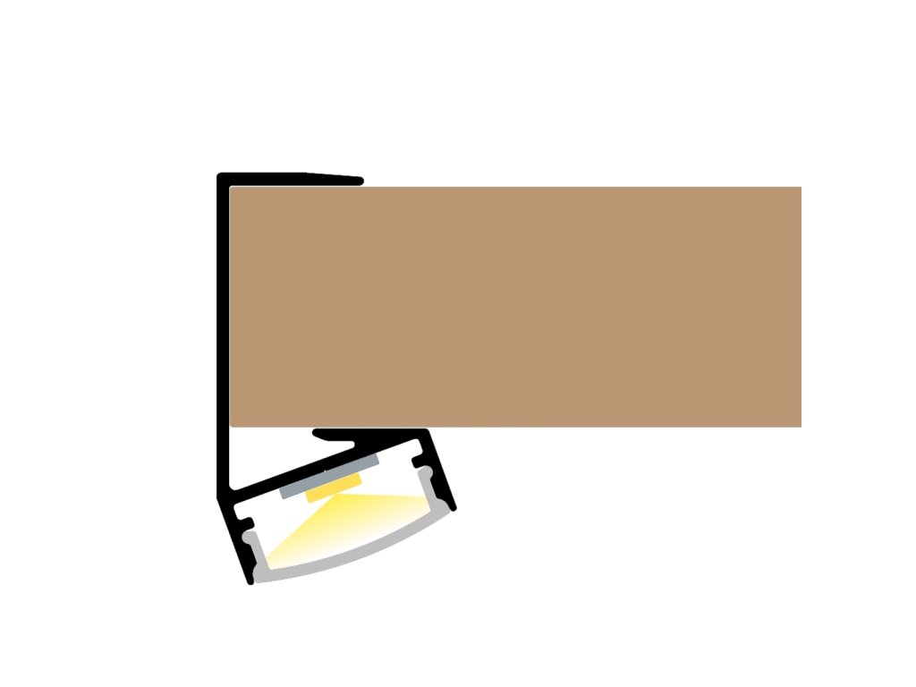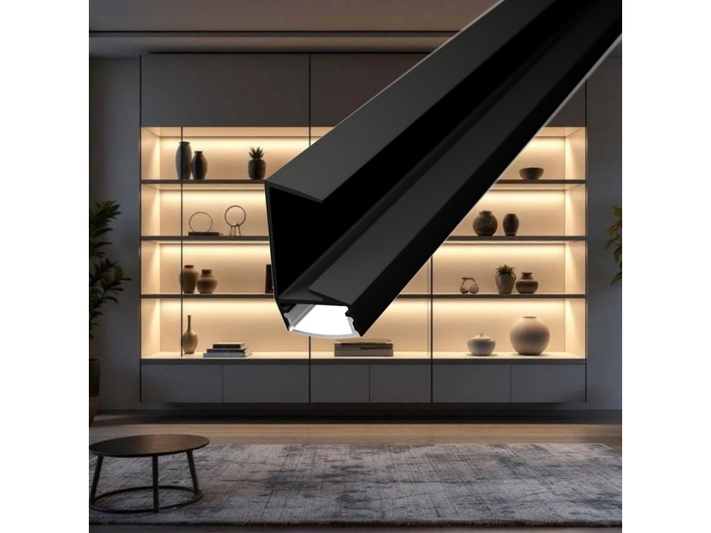 A stílusos és praktikus alumínium profil, amelyet polcok és bútorok megvilágítására terveztek, modern és diszkrét világítási megoldást kínál LED szalagok használatával. Könnyen felcsúsztatható közvetlenül a 18 mm vastag fa polcokra, és a 20°-os lefelé irányuló, átgondolt világítási szögnek köszönhetően hatékonyan emeli ki a polc alatti területet anélkül, hogy zavarná a belső tér összképét.