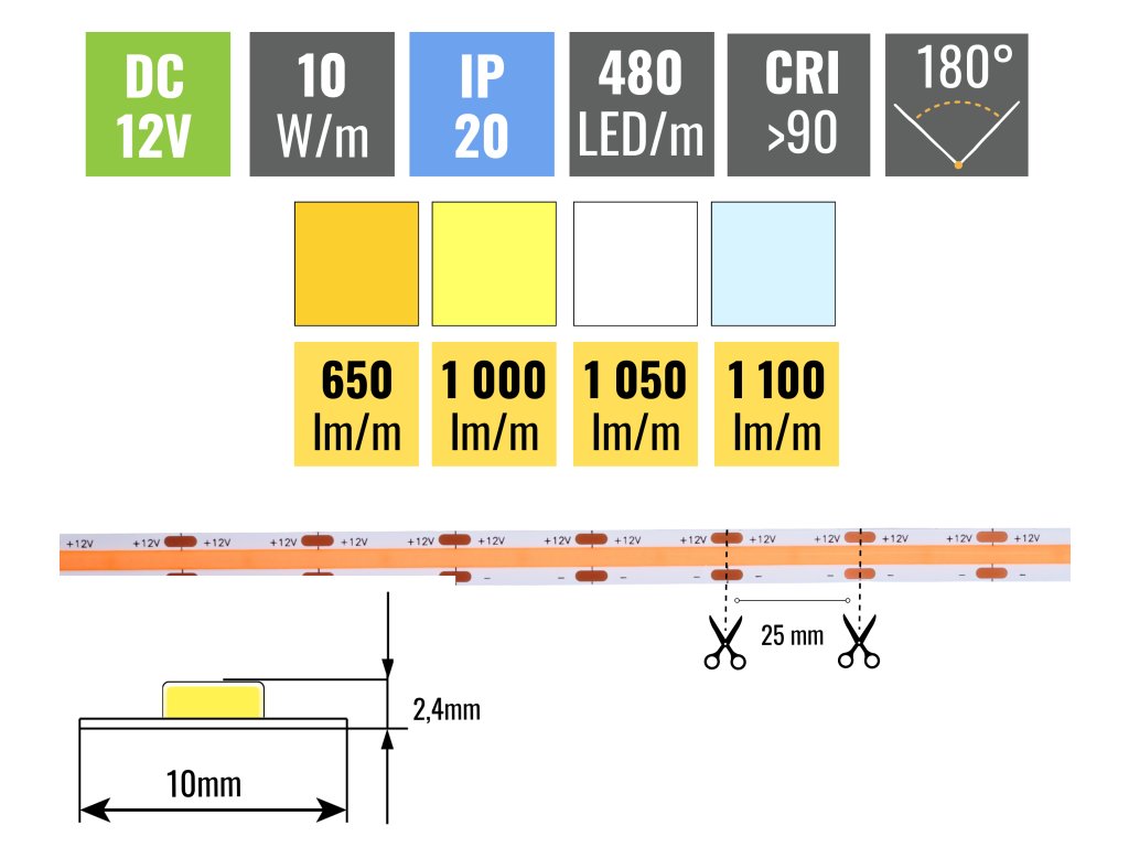 A 10W/m teljesítményből a szalag akár 1100lm/m teljesítményt is produkál. A LED-ek sűrűsége 480db/m, így a szalag teljes hosszában egyenletesen világít. Ezt a szalagot be kell ragasztani alumínium sínek a LED-ek hőleadása miatt. Minden a szalagok 3M 300LSE öntapadó fóliával vannak ellátva, amely tökéletesen tapad az aljzatra. Az alapnak simának kell lennie és a szalag felragasztása előtt alaposan zsírtalanítani kell.