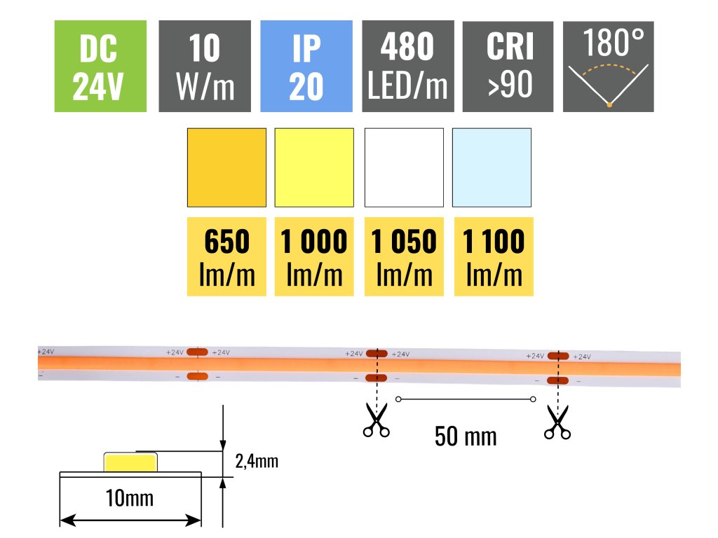 A 10W/m teljesítményből a szalag akár 1100lm/m teljesítményt is produkál. A LED-ek sűrűsége 480db/m, így a szalag teljes hosszában egyenletesen világít. Ezt a szalagot be kell ragasztani alumínium sínek a LED-ek hőleadása miatt. Minden a szalagok 3M 300LSE öntapadó fóliával vannak ellátva, amely tökéletesen tapad az aljzatra. Az alapnak simának kell lennie és a szalag felragasztása előtt alaposan zsírtalanítani kell.