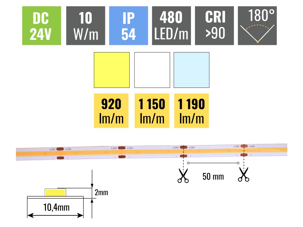 A 10W/m teljesítményből a szalag akár 1190lm/m fényt produkál. A LED-ek sűrűsége 480db/m, így a szalag teljes hosszában egyenletesen világít. Ezt a szalagot be kell ragasztani alumínium sínek a LED-ek hőleadása miatt. Minden a szalagok 3M 300LSE öntapadó fóliával vannak ellátva, amely tökéletesen tapad az aljzatra. Az alapnak simának kell lennie és a szalag felragasztása előtt alaposan zsírtalanítani kell.