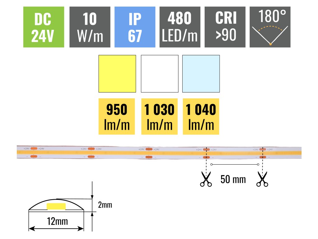 A 10W/m teljesítményű szalag akár 1040lm/m fényt is kibocsát. A LED-ek sűrűsége 480db/m, így a szalag teljes hosszában egyenletesen világít. Ezt a szalagot be kell ragasztani alumínium sínek a LED-ek hőleadása miatt. Minden a szalagok 3M 300LSE öntapadó fóliával vannak ellátva, amely tökéletesen tapad az aljzatra. Az alapnak simának kell lennie és a szalag felragasztása előtt alaposan zsírtalanítani kell.