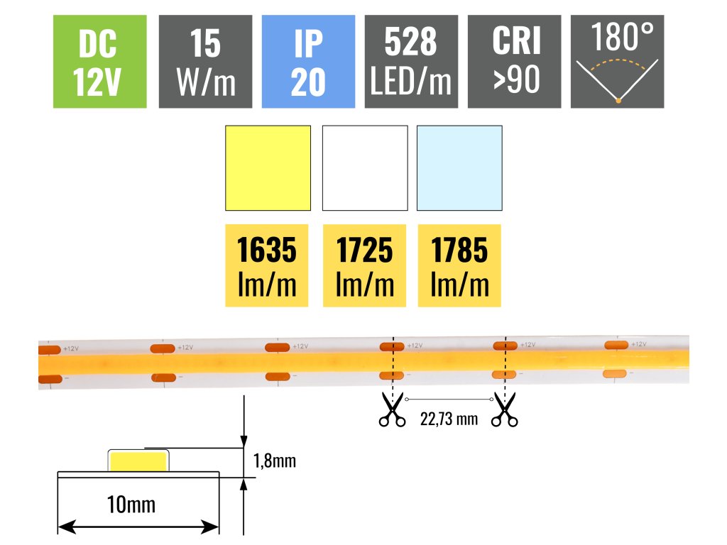 COB LED-szalag 15W/m 12V védelem nélkül IP20