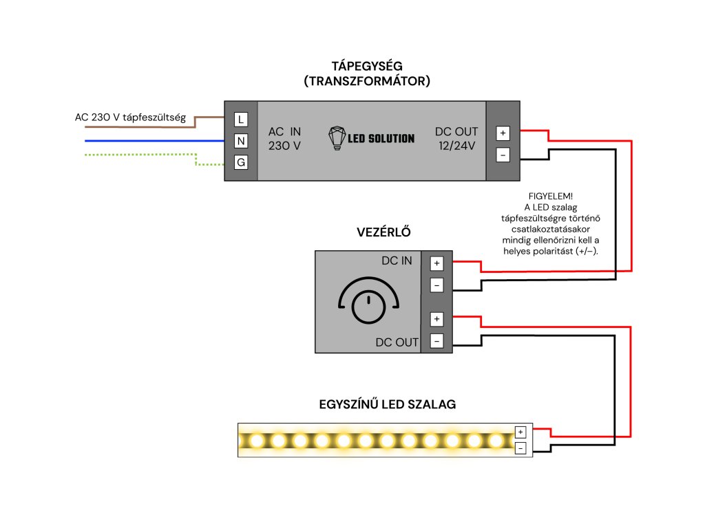 Amennyiben 5 méternél hosszabb LED-szalagot készül bekötni, javasoljuk a szalagot mindkét végéről táplálni, ezáltal nem kockáztatja a fényerősség látható csökkenését.