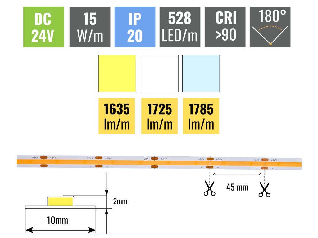 A 15W/m teljesítménytől a szalag akár 1785lm/m teljesítményt is produkál. A LED-ek sűrűsége 528db/m, a szalag teljes hosszában egyenletesen világít. Ezt a szalagot be kell ragasztani alumínium sínek a LED-ek hőleadása miatt. Minden a szalagok 3M 300LSE öntapadó fóliával vannak ellátva, amely tökéletesen tapad az aljzatra. Az alapnak simának kell lennie és a szalag felragasztása előtt alaposan zsírtalanítani kell.