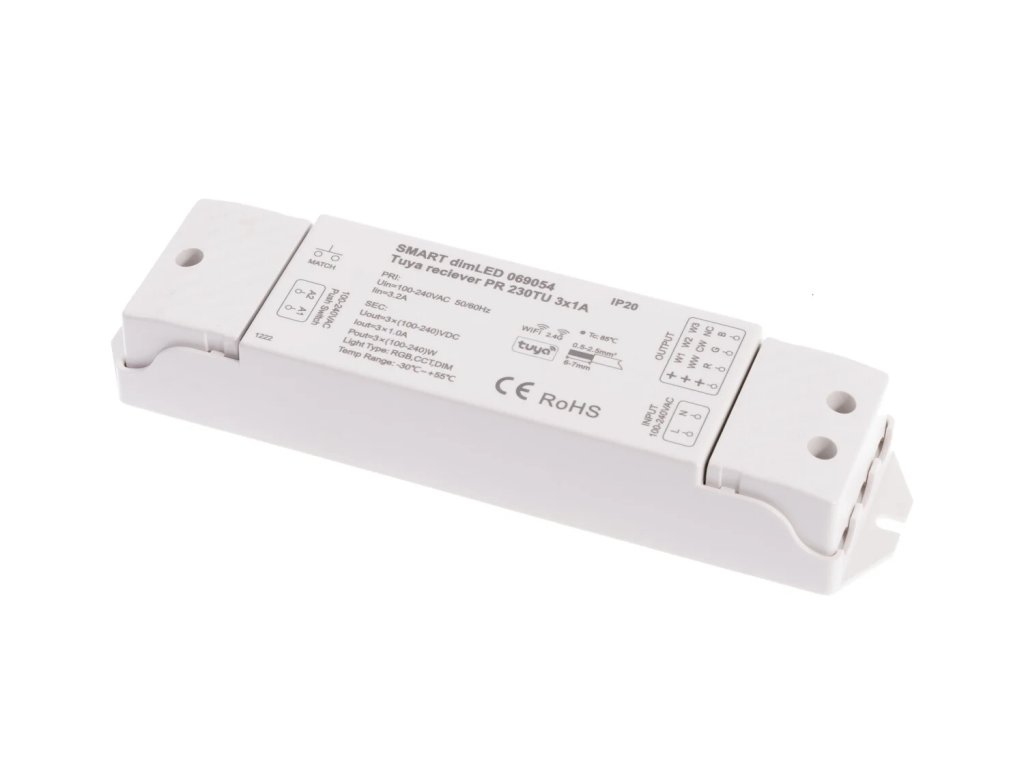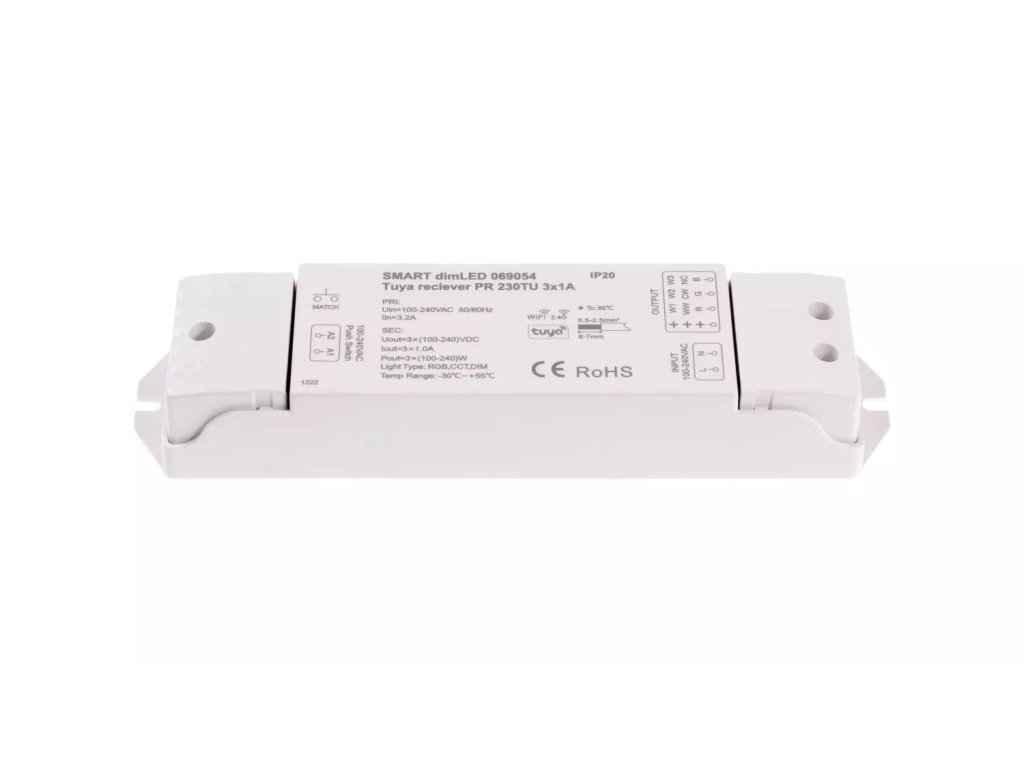 A vevő teljes mértékben kompatibilis az összes dimLED vezérlővel, és emellett támogatja az okosotthonhoz való csatlakozást a TUYA alkalmazáson keresztül, valamint az Amazon Alexa és a Google Assistant hangasszisztensek segítségével. Ennek köszönhetően a vezérlés nemcsak távirányítóval, hanem telefonnal, tablettel vagy hanggal is elvégezhető. A kézi vezérléshez egy sorkapocs áll rendelkezésre egy szokásos mechanikus gomb csatlakoztatásához, így a vevő alkalmazás használata nélkül is vezérelhető. Egy vevőhöz akár tíz különböző dimLED vezérlő is párosítható, ami lehetővé teszi a kényelmes vezérlést több helyről.