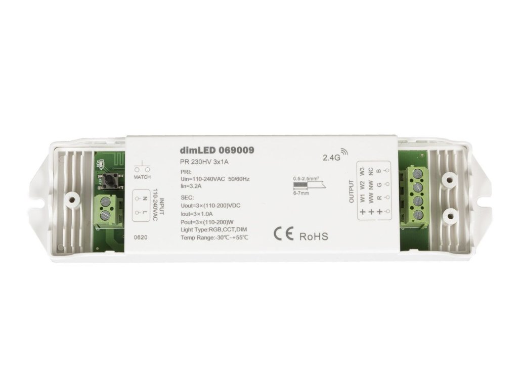 A rádiófrekvenciás vevő lehetővé teszi a 230 V-os LED szalagok vezeték nélküli vezérlését, mind az egyszínű, mind az RGB változatoknál – beleértve a LED NEON szalagokat is. A vevő automatikusan felismeri a párosított vezérlő típusát, és alkalmazkodik a használt kapcsoláshoz. Egyszínű szalagok esetén mindhárom csatorna egyszerre vezérelhető, RGB változatoknál az egyes színösszetevők külön-külön vezérelhetők.