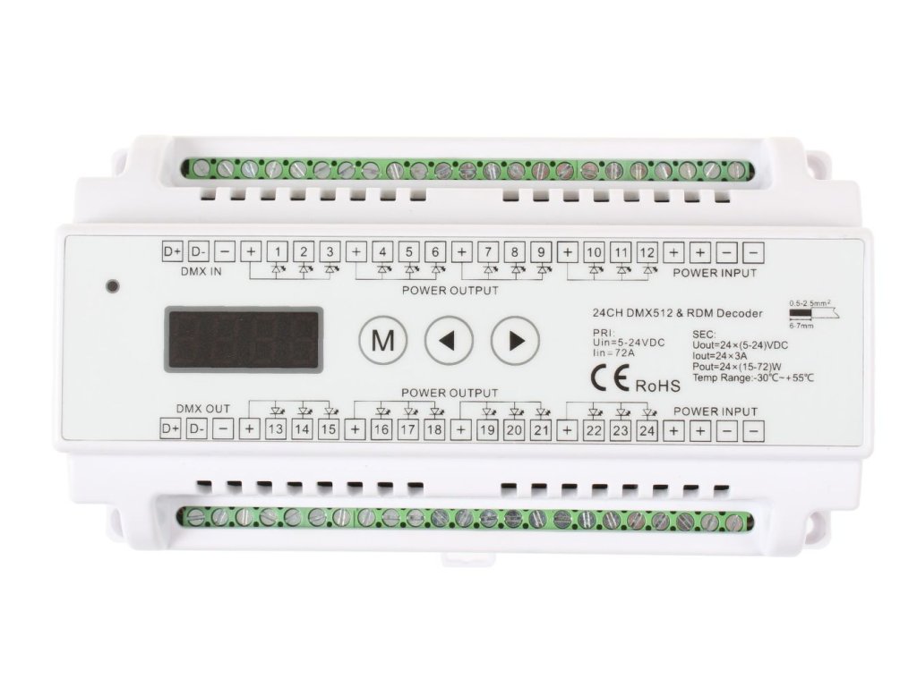 A DMX dekóder egy 24 csatornás átalakító, amelyet közös anóddal rendelkező LED-rendszerek DMX-konzolon keresztüli vezérlésére terveztek, beleértve a monokróm és RGB szalagokat.