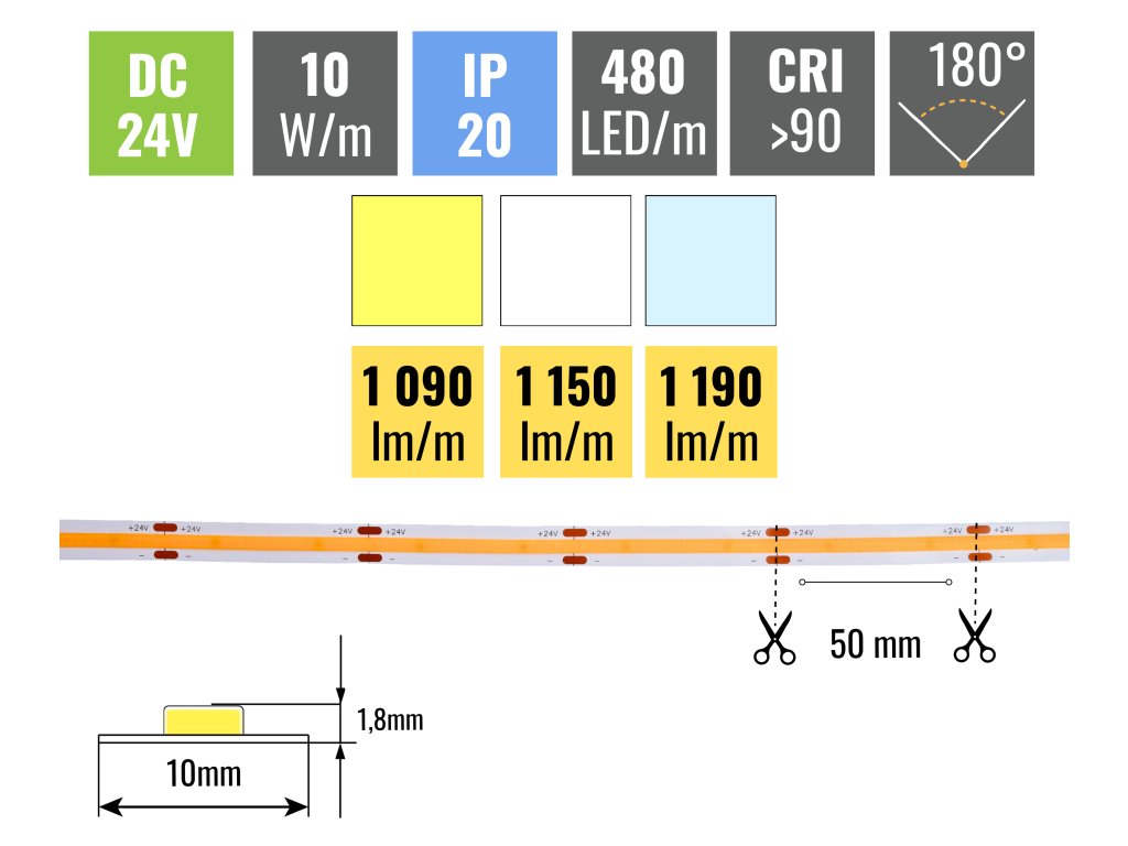 A 10W/m teljesítményből a szalag akár 1190lm/m-t is termel. A LED-ek sűrűsége 480db/m, így a szalag teljes hosszában egyenletesen világít. Ezt a szalagot be kell ragasztani alumínium sínek a LED-ek hőleadása miatt. Minden a szalagok 3M 300LSE öntapadó fóliával vannak ellátva, amely tökéletesen tapad az aljzatra. Az alapnak simának kell lennie és a szalag felragasztása előtt alaposan zsírtalanítani kell.