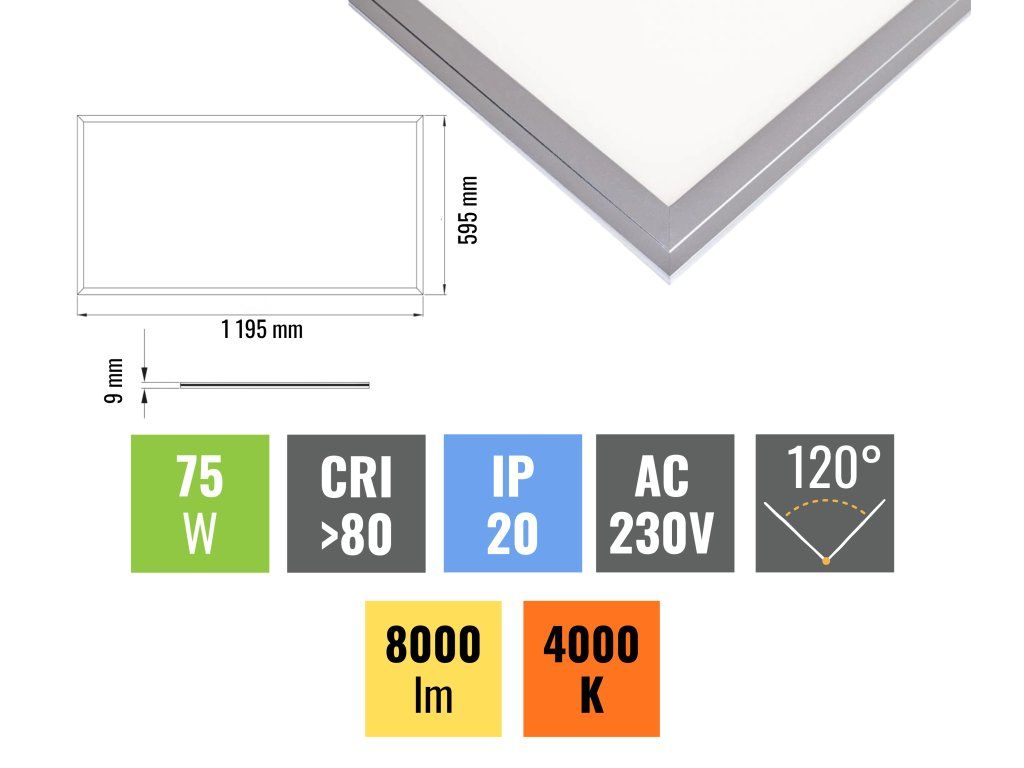 Ezüst mennyezeti LED-panel, 600 x 1200mm, 75W, Premium