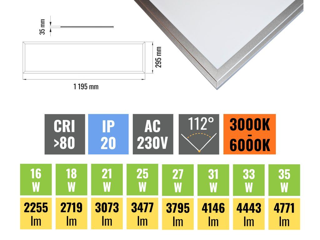 A prémium LED panel állítható teljesítményű és fényhőmérsékletű, ideális megoldás álmennyezeti alkalmazásokhoz. A 30 x 120 cm-es, 16-35 W teljesítményű panel könnyen felszerelhető kazettás mennyezetbe, de a megfelelő tartozékokkal gipszkartonba is rögzíthető, tégla mennyezetre rögzíthető vagy felakasztható.