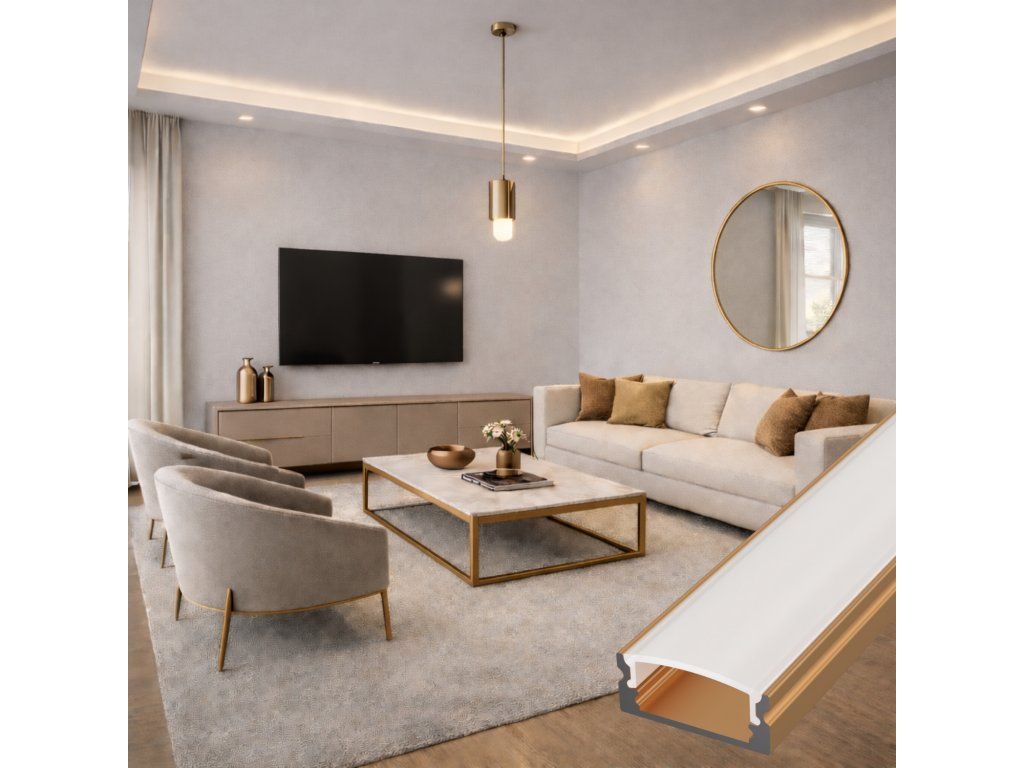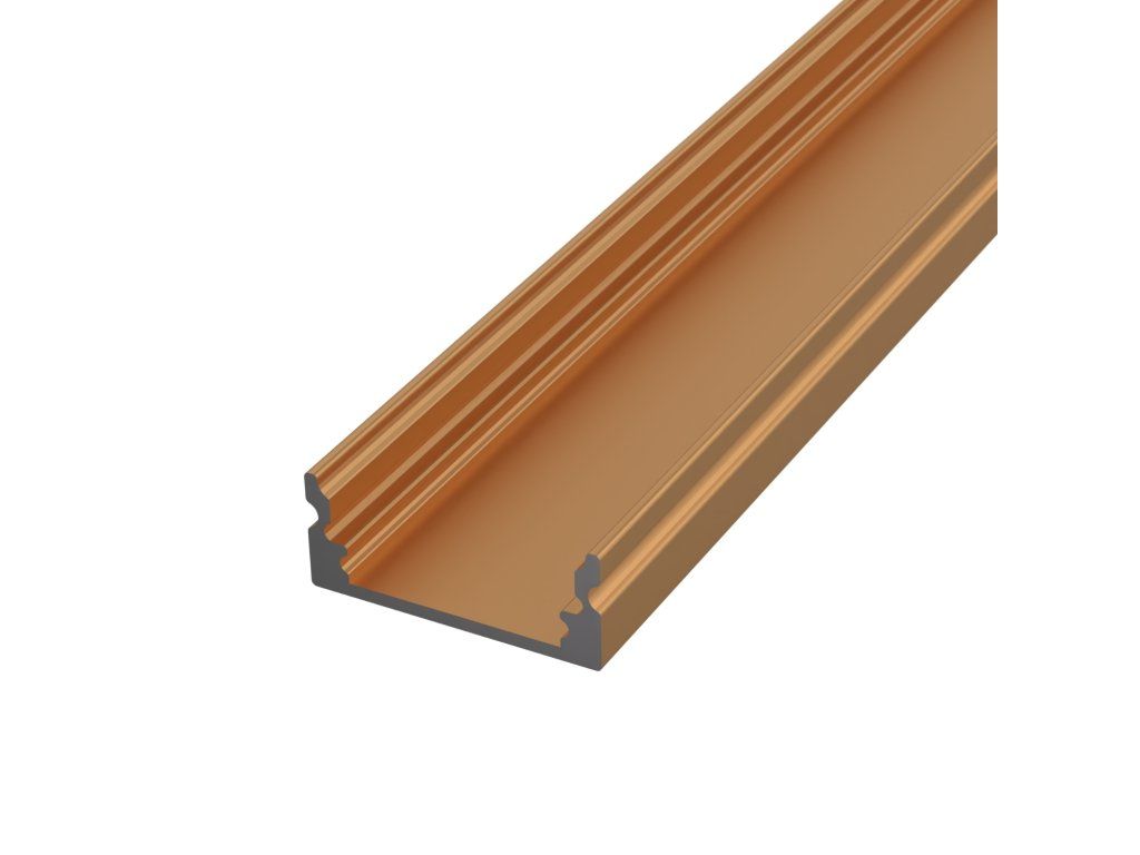 Az alumínium falra szerelhető profil elegáns bronz kivitelben hűtőbordaként szolgál a LED szalaghoz, és egyben markáns dizájnelem is, amely jól illeszkedik fával, kővel vagy meleg fém kiegészítőkkel berendezett belső terekbe. Színárnyalatának köszönhetően nem tűnik technikainak, hanem természetesen egészíti ki a modern és az ipari tereket.
