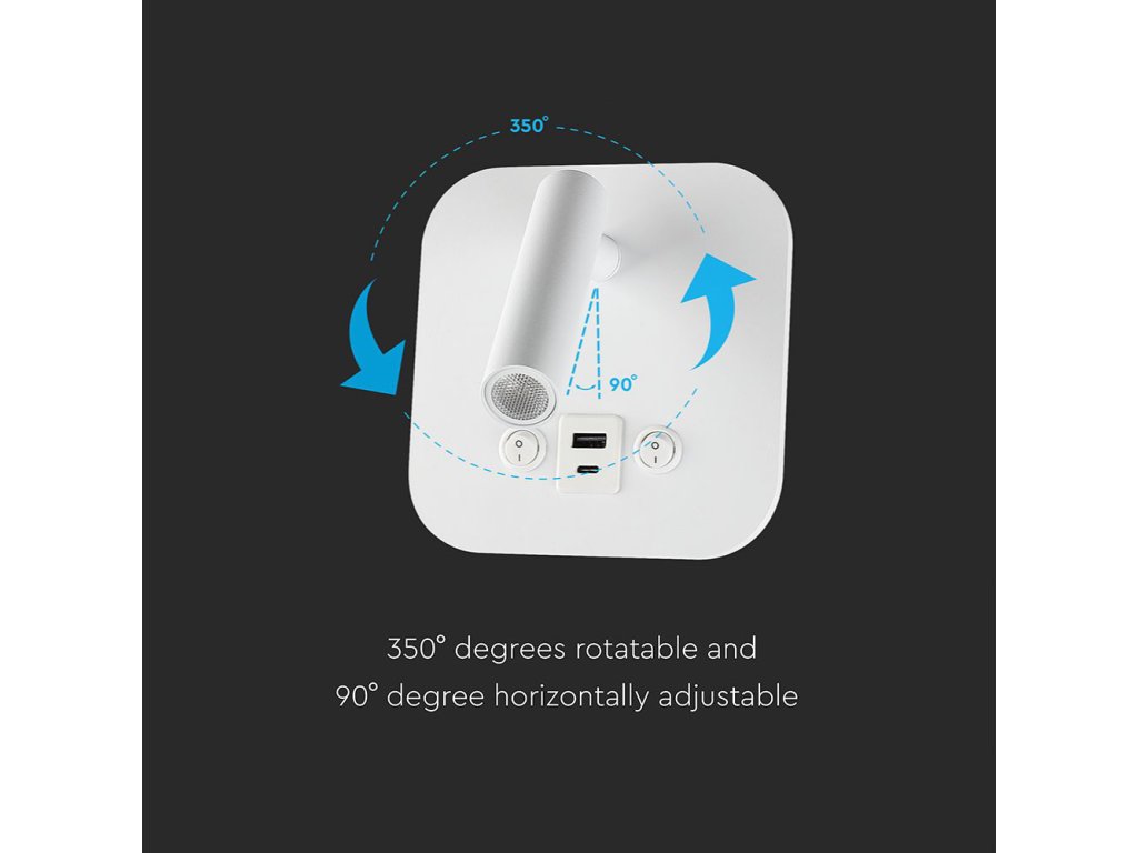 A lámpa forgatható fejjel rendelkezik, amely 350°-ban elforgatható és 90°-ban felhajtható, így a fénycsóvát könnyen oda irányíthatja, ahol szüksége van rá. Ráadásul USB és USB-C/PD portokkal van felszerelve a mobileszközök gyors töltéséhez akár 20 W-os teljesítménnyel – így telefonját vagy táblagépét közvetlenül az ágy mellett töltheti, anélkül, hogy szabad aljzatot kellene keresnie.