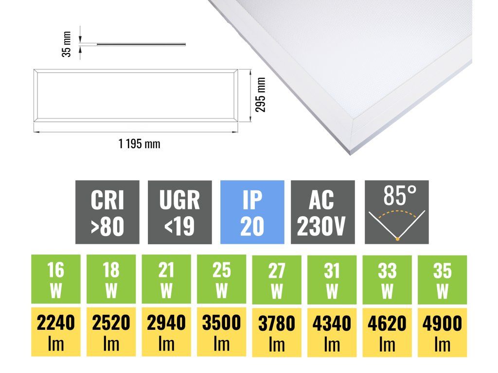 Prémium LED panel állítható teljesítményű 16-35W és 140lm/W hatásfok nagyszerű áron. Az UGR modell egyedi mikroprizmás borítással rendelkezik, amely kiváló fényszórást biztosít és minimalizálja a kellemetlen tükröződést. Használható például tantermekben, rendelőkben vagy tervezőműtermekben. Ez a 16-35 W-os , 30 x 120 cm-es panel tökéletes álmennyezeti alkalmazásokhoz. Könnyen beilleszthető kazettás mennyezetekbe, de gipszkartonba való beépítéshez vagy tégla mennyezetre való rögzítéshez vagy függesztéshez is rendelhető tartozékokkal.