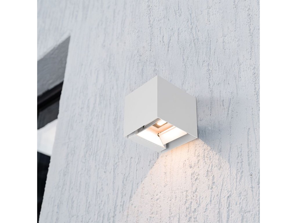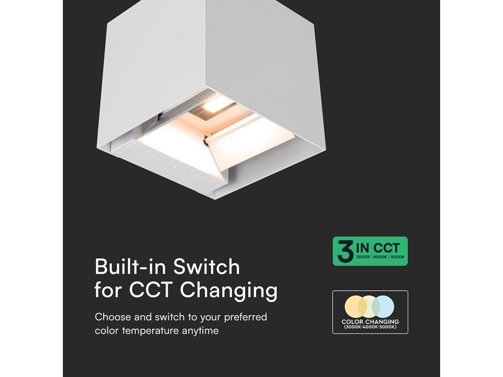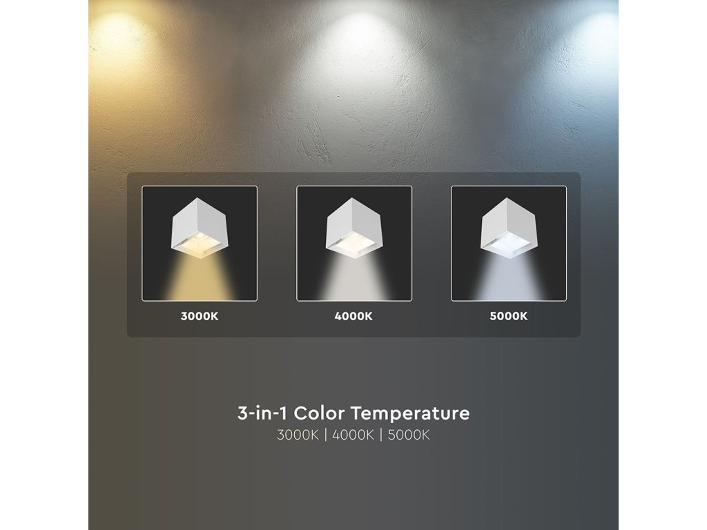 Fehér napelemes LED homlokzati lámpa szögletes kialakítással 9W teljesítménnyel rendelkezik, ötvözve a modern megjelenést a praktikus funkcionalitással a kültéri terek számára. A beépített CCT DIP kapcsolónak köszönhetően közvetlenül a lámpatesten választható meg a fény színe – meleg (3000K), természetes fehér (4000K) vagy hideg (5000K), így a világítást könnyedén hozzáigazíthatja a környezet hangulatához és az adott felhasználáshoz..