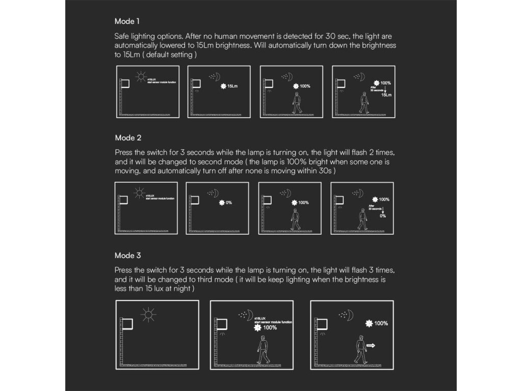 1. üzemmód – A lámpa az ON/OFF gombbal történő bekapcsolás után aktiválódik, és sötétedés után folyamatosan, alacsony, 15 lm fényerővel világít. Mozgás érzékelésekor 100%-ra kapcsol, és mozgás hiányában 30 másodperc után visszatér az alacsony, 15 lm-es fényerőhöz.