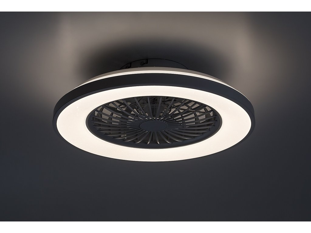 A lámpatest része egy beépített, 15 W teljesítményű ventilátor, amelynek sebessége az aktuális igényeknek megfelelően állítható. A ventilátor hatékony légkeringetést biztosít, és akár 33 m²-es helyiségekbe is alkalmas. A működés csendes, zajszintje körülbelül 30 és 50 dB között mozog a választott sebességtől függően, ami lehetővé teszi a használatát hálószobákban vagy dolgozószobákban is.