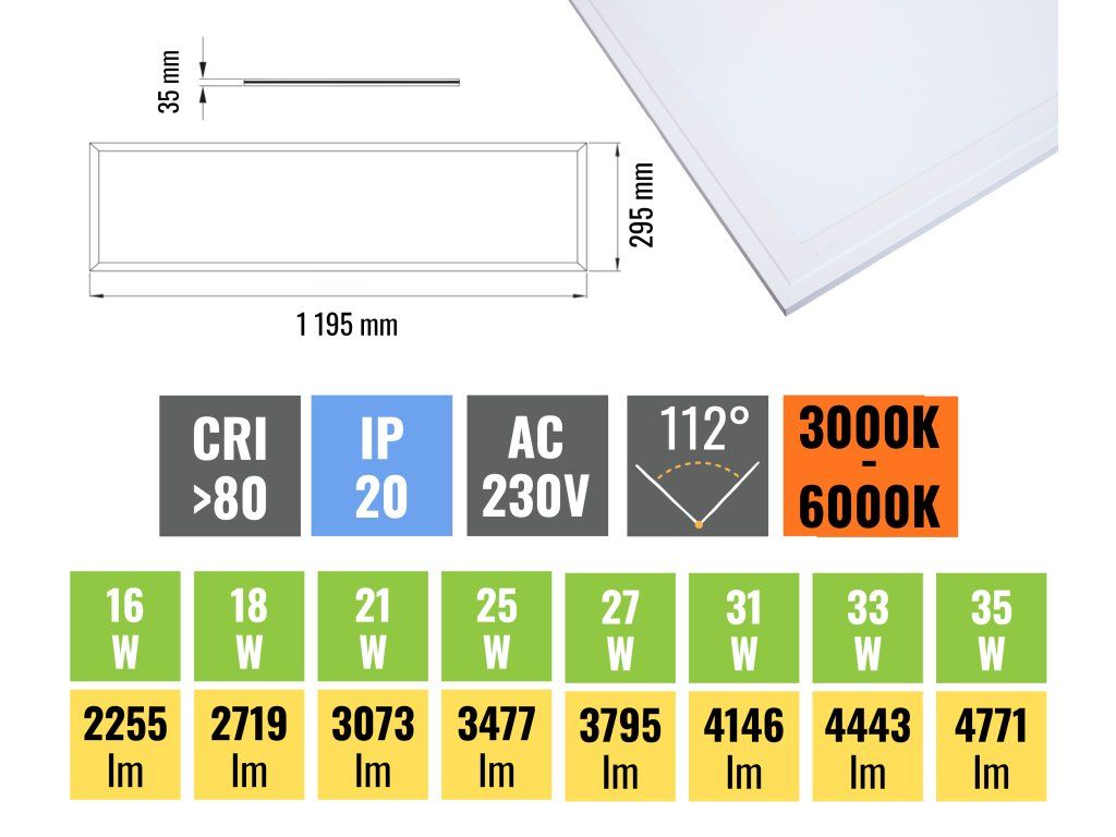 Fehér LED mennyezeti panel 30 x 120cm 16-35W CCT Premium