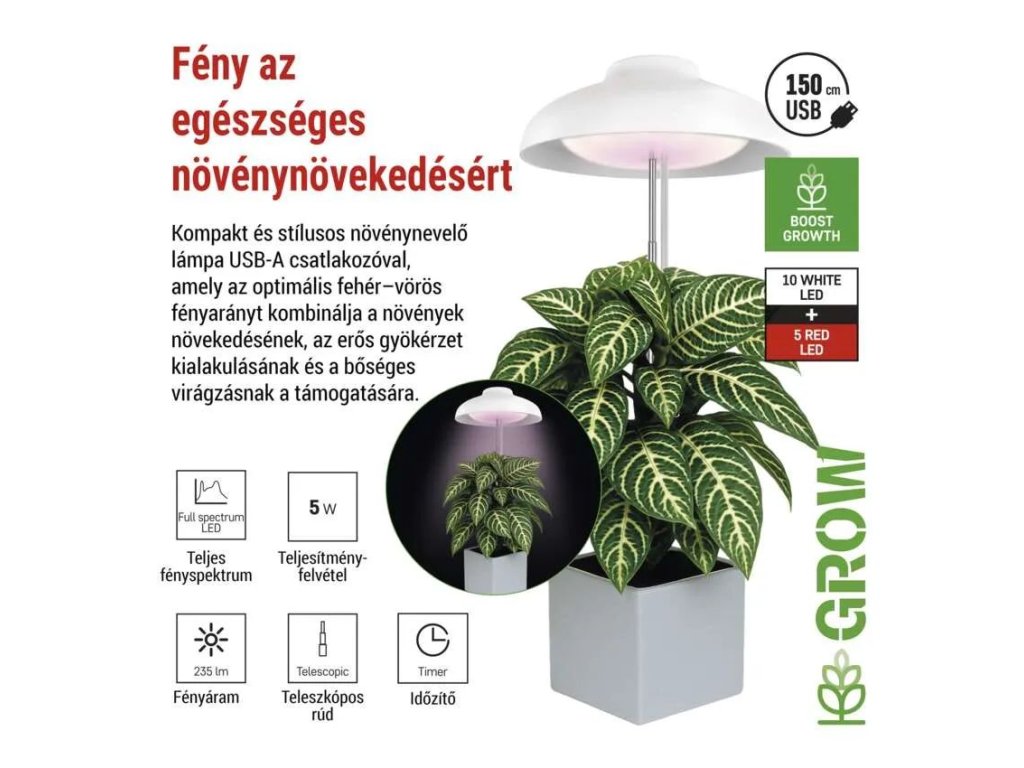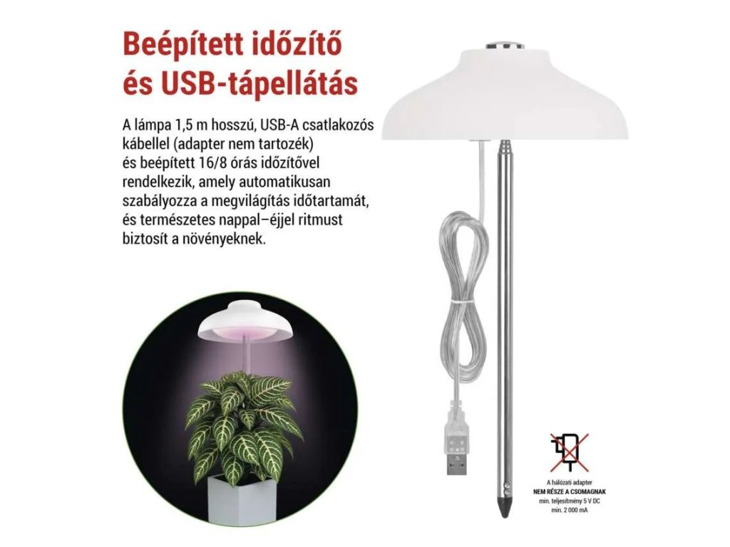 A lámpa USB-A csatlakozó és 1,5 m hosszú kábel segítségével működik, amely lehetővé teszi az USB adapterhez, powerbankhoz vagy számítógéphez való csatlakoztatást. A beépített időzítő 16/8 órás üzemmóddal automatikusan váltja a világítási és sötét időszakot, segítve ezzel a növényeket a természetes napi ritmus fenntartásában, kézi vezérlés nélkül.