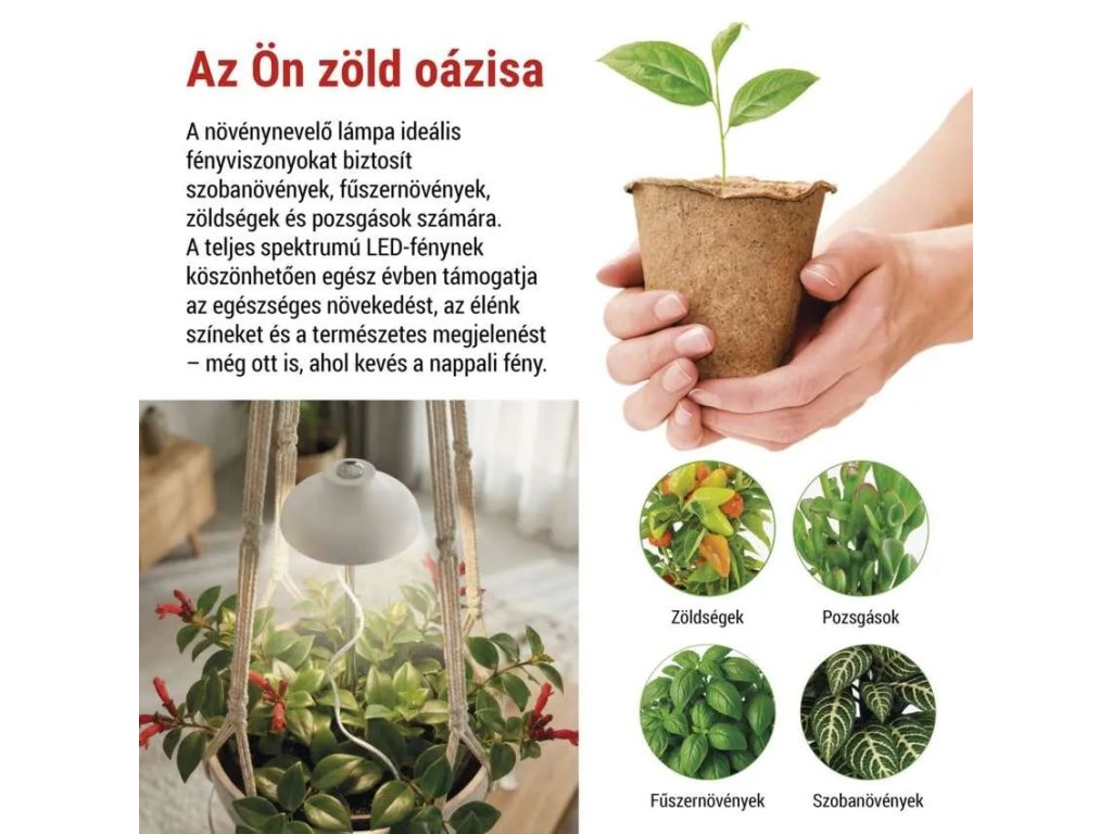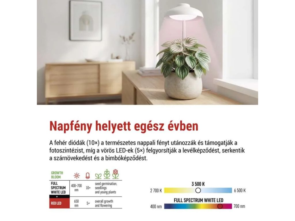 A LED növekedési lámpa kompakt és elegáns megoldás szobanövények, fűszernövények, zöldségek és szukkulensek beltéri növekedésének támogatására. Biztosítja a növények számára a szükséges fényt mindenhol, ahol hiányzik a természetes napfény, és segít megőrizni egészséges megjelenésüket, erős leveleiket és élénk színeiket egész évben, még a téli hónapokban vagy sötétebb helyiségekben is.
