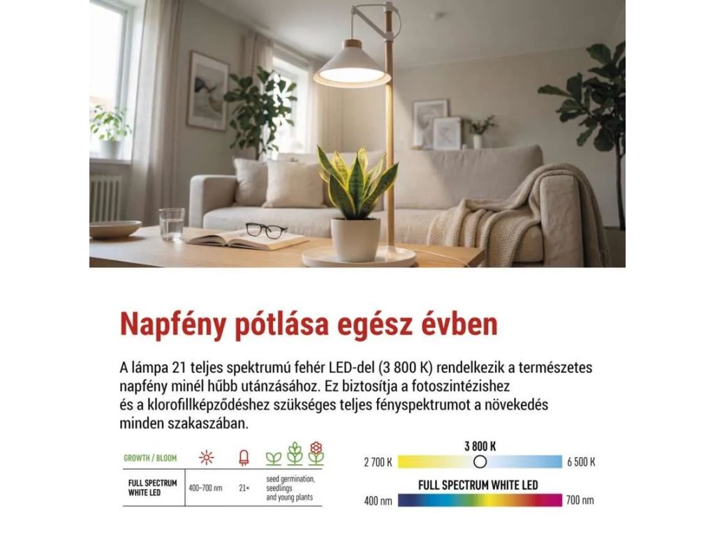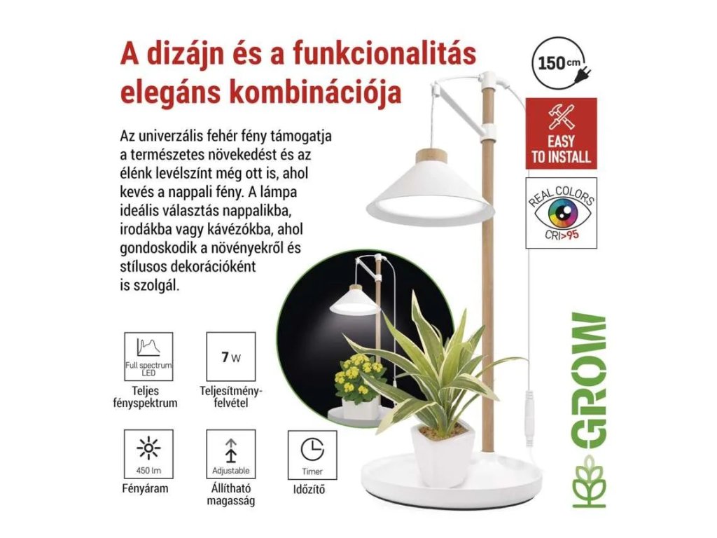 7 W teljesítménynél a lámpa elegendő fénykibocsátást biztosít, miközben energiatakarékos működést tart fenn. A 450 lm fényáram nagyobb szobanövények vagy olyan helyek számára is alkalmas, ahol nagyon korlátozott a természetes fényhez való hozzáférés, és intenzívebb, stabil megvilágításra van szükség.