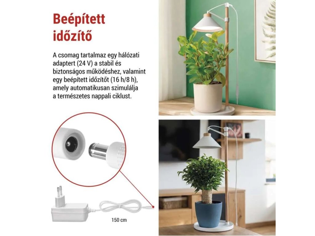 A lámpa része egy beépített időzítő, 16/8 órás üzemmóddal, amely automatikusan szimulálja a természetes nappali ciklust. A növények így a megfelelő ritmusban kapják a fényt anélkül, hogy napi szintű manuális vezérlésre lenne szükség. A csomag tartalmaz egy hálózati adaptert az elektromos hálózathoz való csatlakoztatáshoz, AC 230 V.