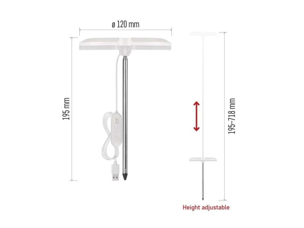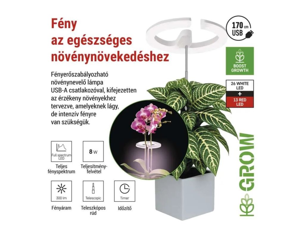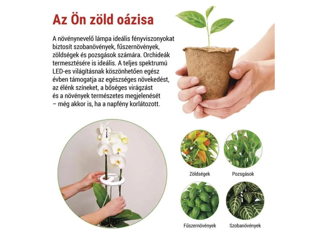 A LED növekedési lámpa kompakt és elegáns megoldás szobanövények, fűszernövények, zöldségek, pozsgások és orchideák beltéri növekedésének támogatására. Biztosítja a növények számára a szükséges fényt mindenhol, ahol hiányzik a természetes napfény, és segít megőrizni egészséges megjelenésüket, erős leveleiket és élénk színeiket egész évben, még a téli hónapokban vagy sötétebb helyiségekben is.