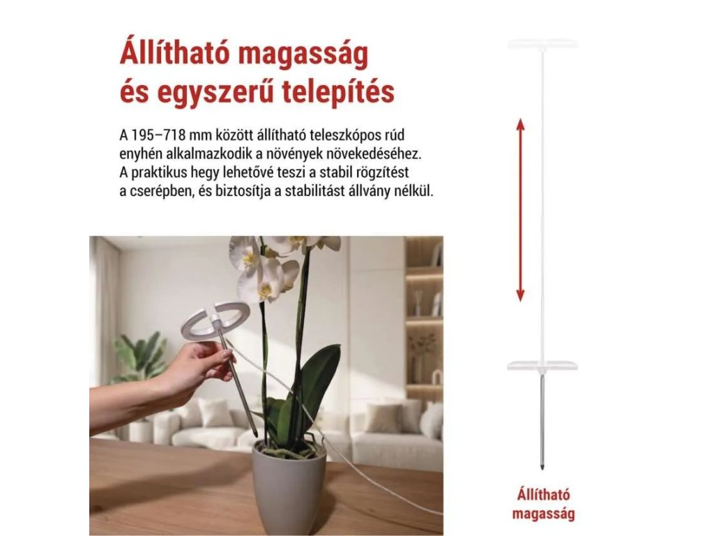 A praktikus, állítható magasságú teleszkópos rúd 195–718 mm tartományban lehetővé teszi a növény méretéhez és növekedéséhez való könnyű alkalmazkodást. A rúd végén található éles hegy biztosítja a szilárd rögzítést közvetlenül a virágcserépbe állvány nélkül, és stabil telepítést tesz lehetővé még a magasabb növények esetében is.