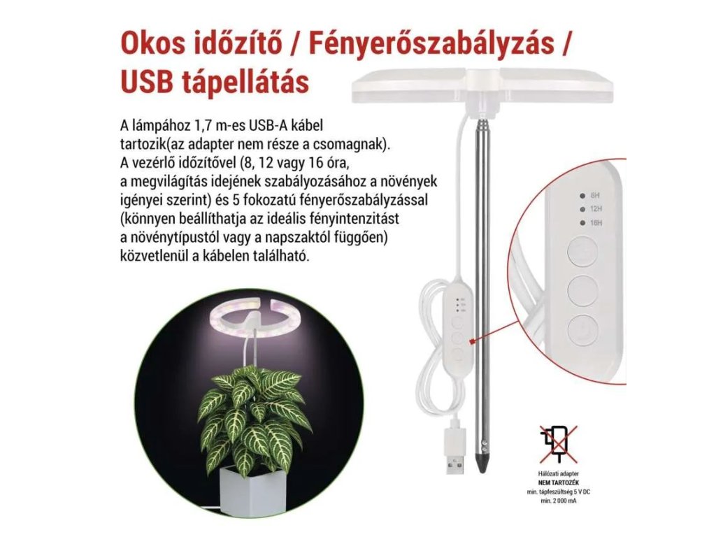 A lámpa 1,7 m hosszú USB-A kábelen keresztül működik, amely lehetővé teszi az USB adapterhez, powerbankhoz vagy számítógéphez való csatlakoztatást. A vezérlés közvetlenül a kábelen található, és beépített időzítővel rendelkezik 8, 12 vagy 16 órás üzemmódokkal, valamint öt lépéses fényerő-szabályozással, amellyel könnyen beállítható a világítás intenzitása a növény típusától vagy a napszaktól függően. A lámpa így támogatja a természetes napi ritmust anélkül, hogy napi szintű manuális vezérlésre lenne szükség.
