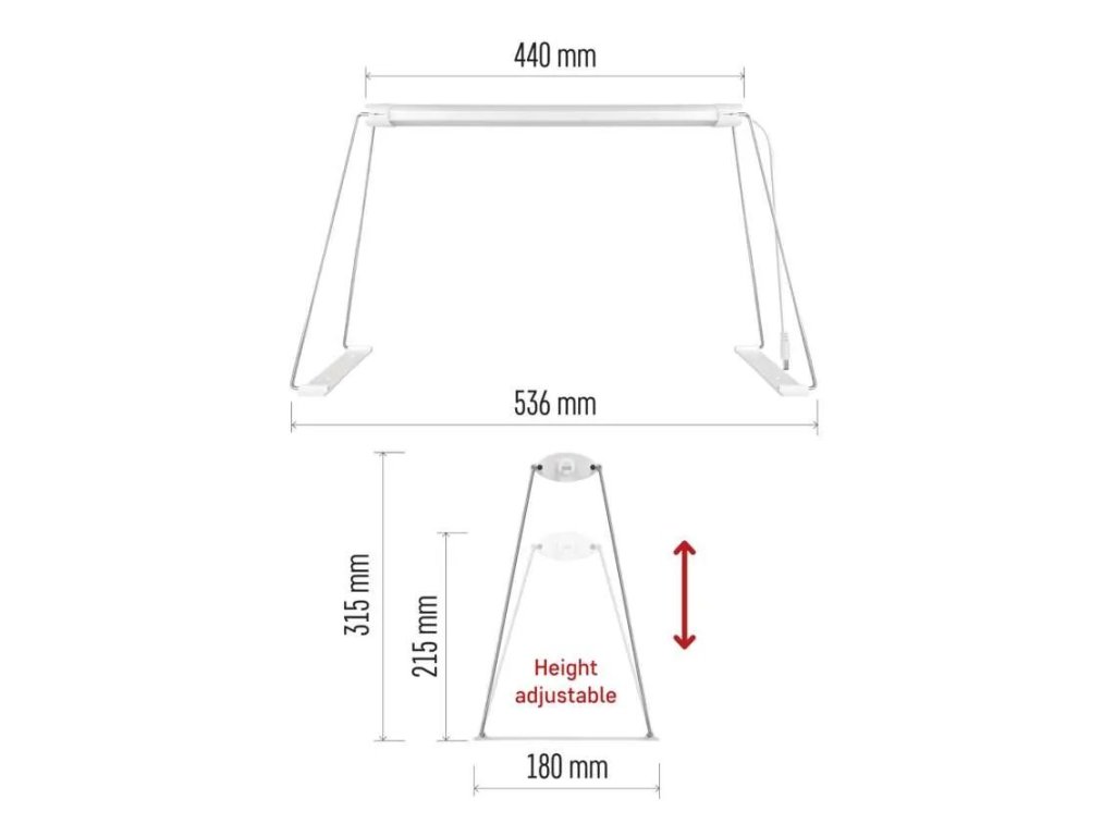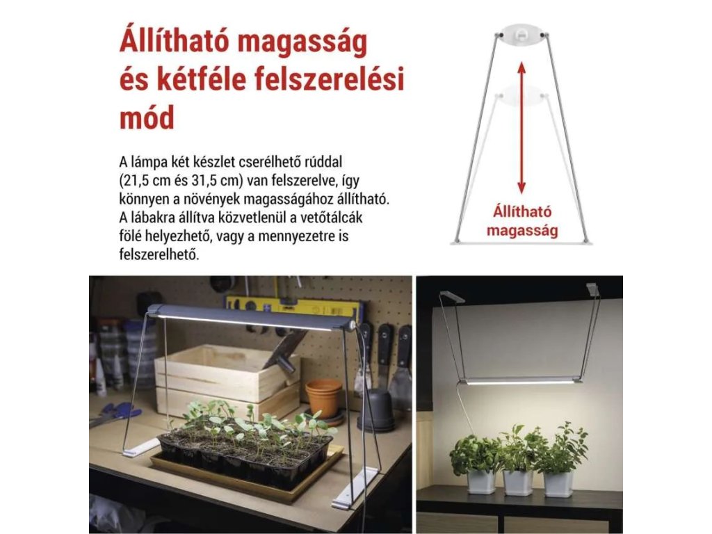 A megvilágítás magassága állítható két cserélhető rúd készlet segítségével, 21,5 cm és 31,5 cm hosszúságú, így a fény pontosan beállítható a növények aktuális magasságához és növekedési fázisához. A fény megfelelő távolsága a palántáktól segít megőrizni kompakt formájukat és megakadályozza a szárak gyengülését.
