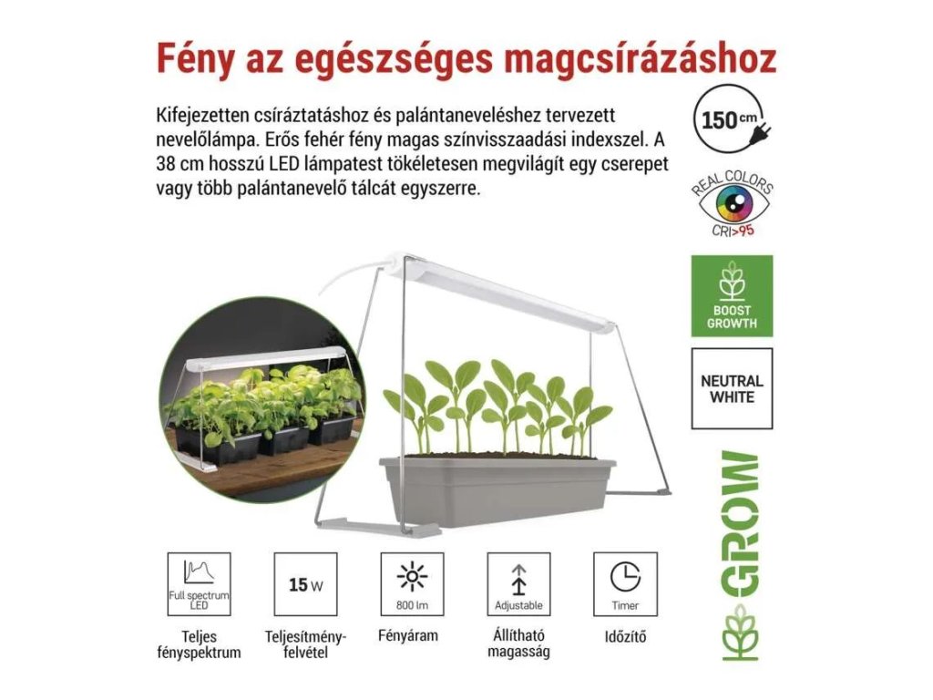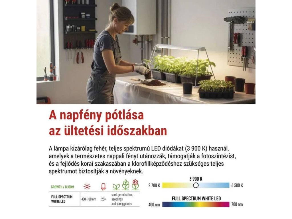 15 W teljesítménnyel a lámpa elegendő intenzitású 800 lm fényáramot biztosít, amely optimalizált a csíráztatáshoz és a fiatal növények növekedéséhez. A fény egyenletesen oszlik el a teljes termesztési felületen, ami kiküszöböli a sötét foltokat, és biztosítja azonos fényellátást minden palánta számára anélkül, hogy folyamatosan mozgatni kellene őket.