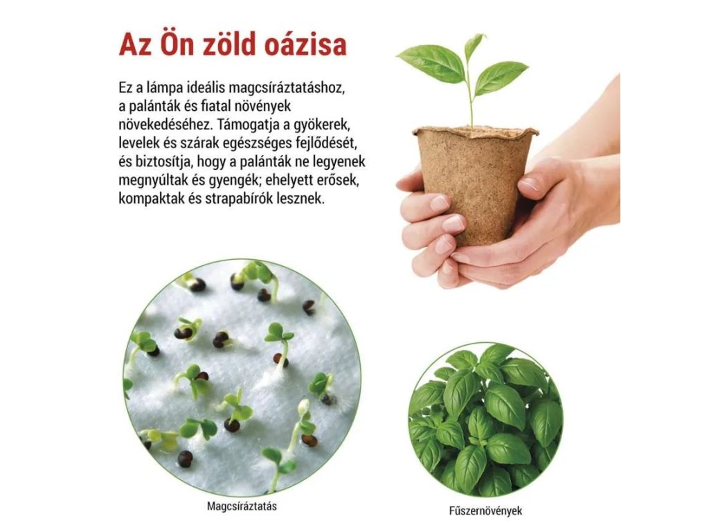 Ez a termesztő lámpa ideális választás magok csíráztatásához, palánták növesztéséhez, fiatal növényekhez és fűszernövényekhez a fejlődés korai szakaszában, mind otthoni környezetben, mind műhelyekben, technikai helyiségekben vagy olyan termesztő sarkokban, ahol nincs elegendő napfény.