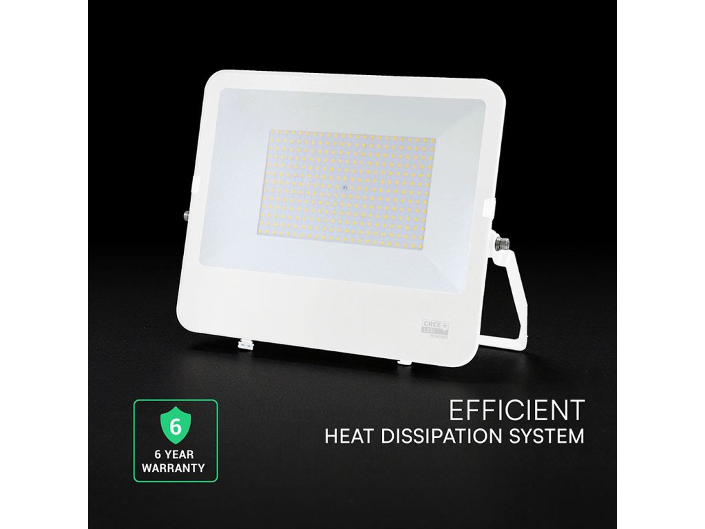 A prémium alumíniumból készült, fehér színű, modern hőelvezetésű robusztus ház akár 30 000 óra hosszú élettartamot és stabil működést garantál nehéz körülmények között is. A korrózióálló bevonat és az IP65 védelem megvédi a reflektort a portól, az esőtől és a nedvességtől, így ideális választás épülethomlokzatokra, ipari területekre, sportpályákra, parkolókra, reklámterületekre vagy kereskedelmi terekbe. A matt előlap egyenletes fényeloszlást biztosít és csökkenti a nem kívánt tükröződést.