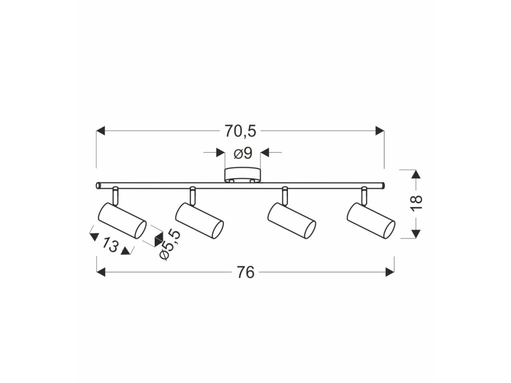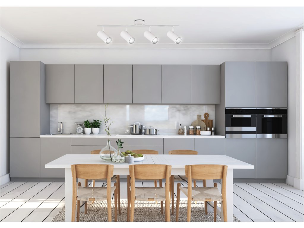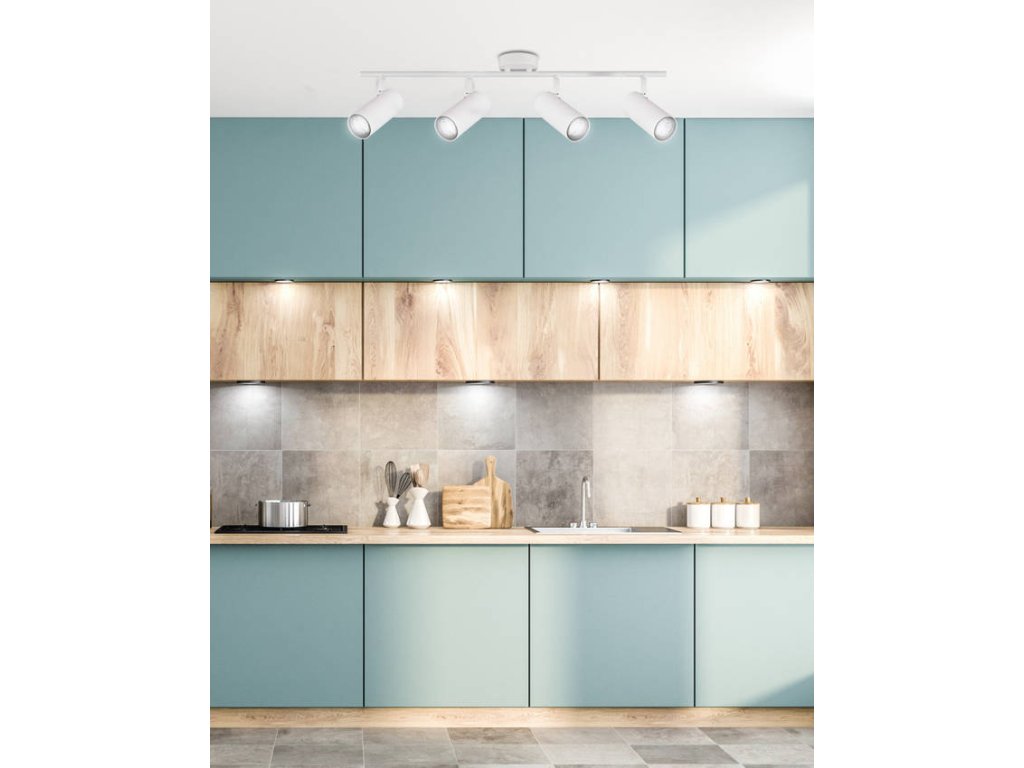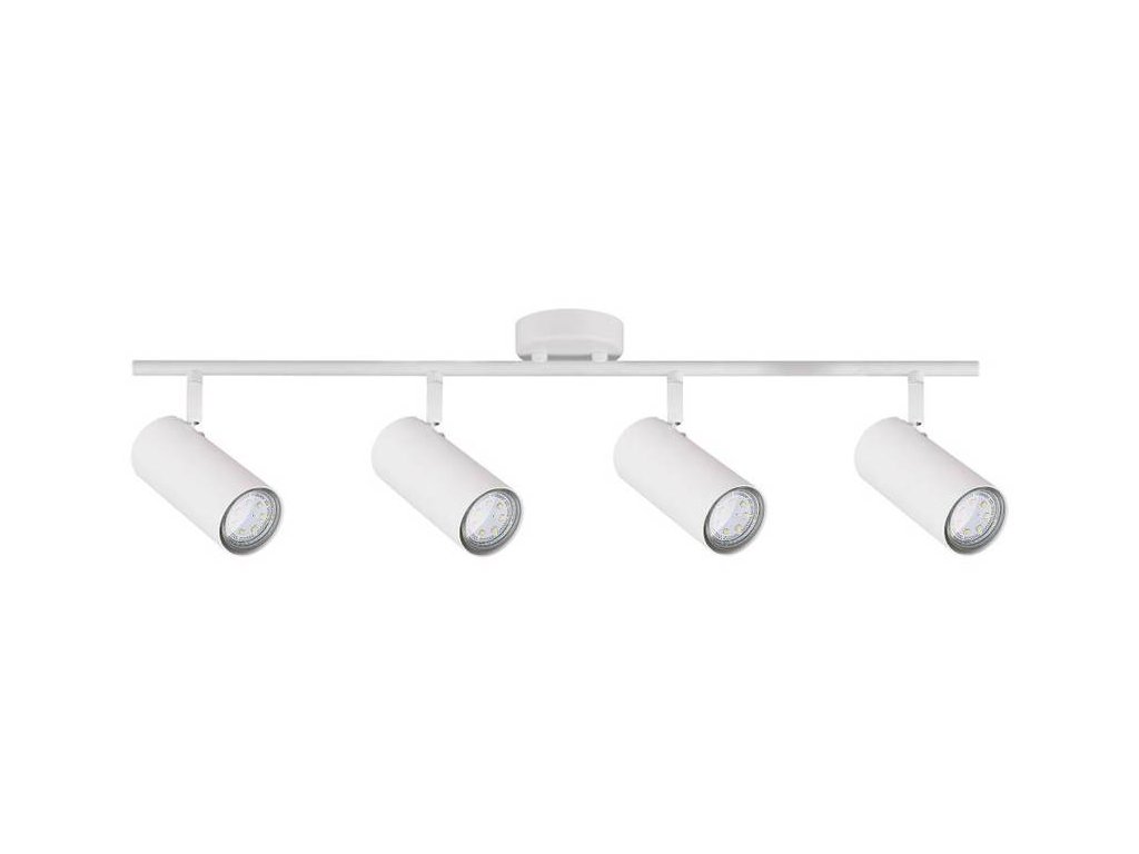 Spot LED lámpatest 4x GU10 foglalattal, max. 15W teljesítményű. Ennek a lámpatestnek a mérete 740x180x90mm. Előnye, hogy az árnyékolók dőlésszöge különböző irányokba állítható, és így a fényt pontosan oda irányíthatja, ahová szüksége van rá. A lámpa fehér fémből készült.
