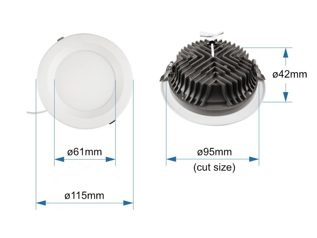 A lámpatest modern, SMD2835 típusú LED chipeket használ, amelyek stabil teljesítményt nyújtanak villogás és zúgás nélkül. A lámpatest méretei ø115 × 42 mm, a beszereléshez pedig egy 95 mm átmérőjű szerelőnyílást kell készíteni.