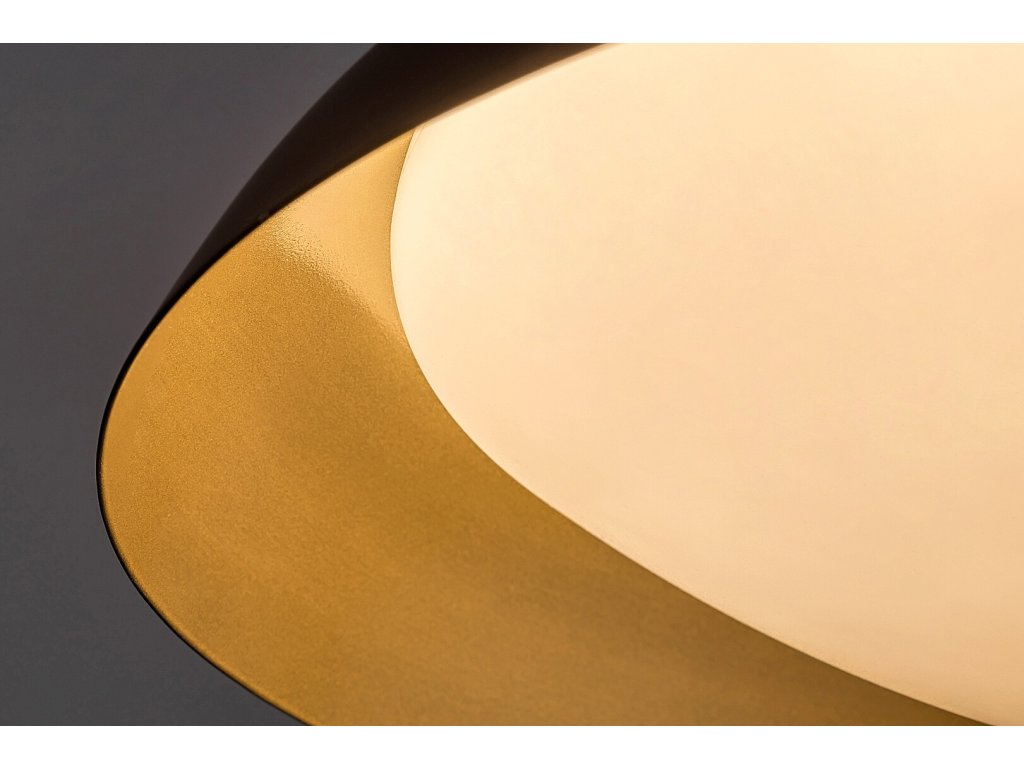 A Hafsa mennyezeti lámpa elegáns fekete-arany kombinációjával és finom, kerek formájával elegáns kiegészítője a modern belső tereknek. A lámpatest kiváló minőségű fémből készült, és széles, lemez alakú testét fehér színű műanyag ernyő egészíti ki, amely biztosítja az egyenletes fényeloszlást.