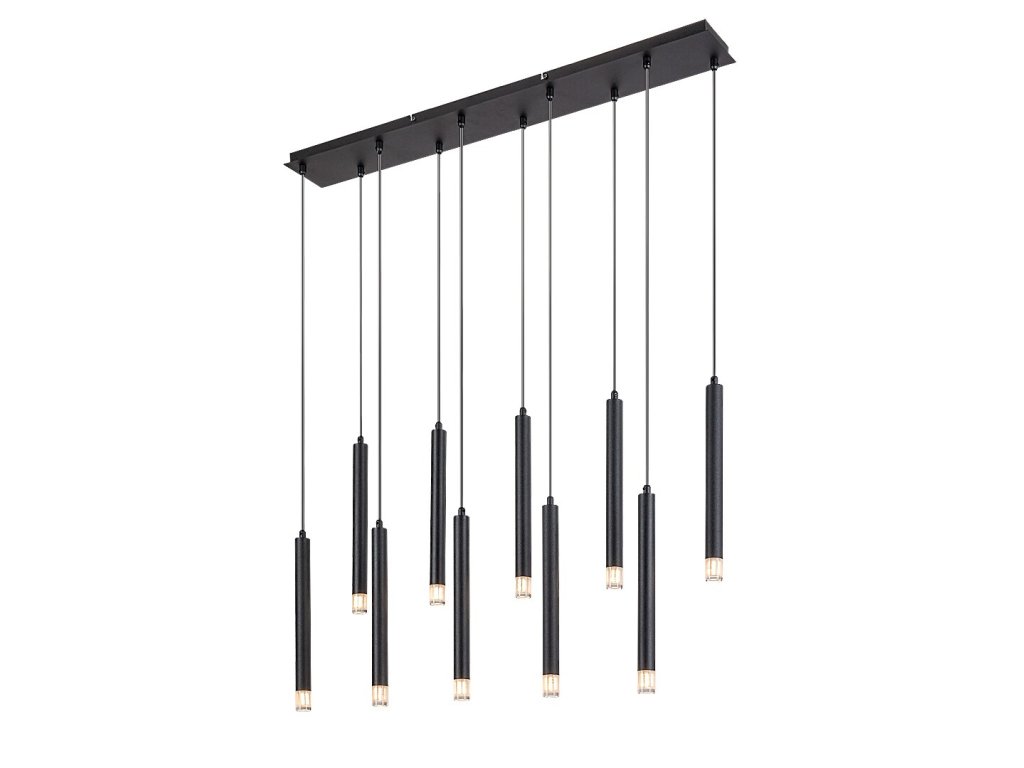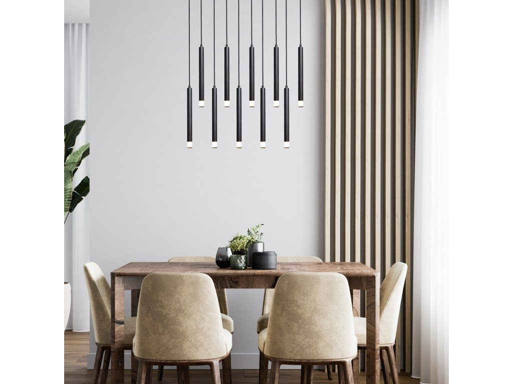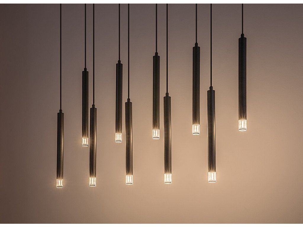 A Ramira függőlámpa minimalista dizájnjával tűnik ki, amely vékony, csöves fényelemeken alapul, amelyek könnyed, elegáns és technikailag tiszta hatást keltenek a térben. A tíz fényforrással rendelkező változat lineáris elrendezésben készült, ahol az egyes függesztékek egymás mellett, egyenes vonalban helyezkednek el. Ez a megoldás ideális a hosszirányú felületek megvilágítására, és vizuális rendet és egyensúlyt kölcsönöz a belső térnek.