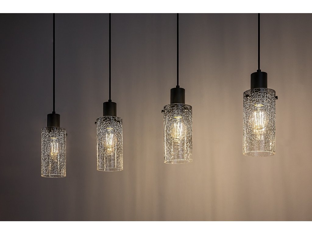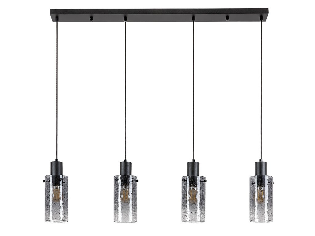 A lámpatest konstrukciója egy hosszú, téglalap alakú, fekete mennyezeti alapból áll, amelyből négy, egyforma magasságú, különálló fénypont van egy vonalban felfüggesztve. Minden egyes függeszték füstüveg henger alakú lámpabúrával van felszerelve, finoman strukturált felülettel, amely kellemesen lágyítja a fényt és vonzó fényhatást kelt. Az átlátszó lámpabúra ugyanakkor láthatóvá teszi a fényforrást, így ez a változat ideális design filament vagy formás izzók használatához.