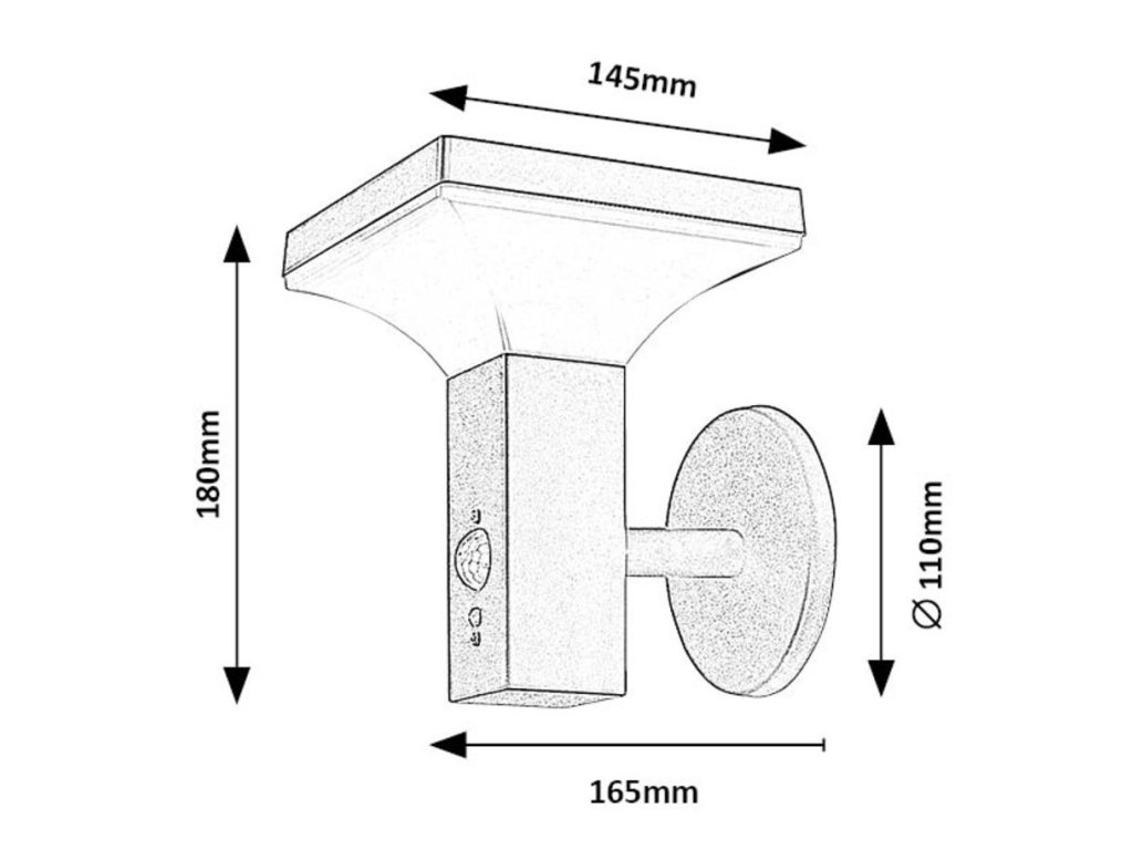 A lámpatest méretei 145 mm széles, 180 mm magas és 165 mm távolságra van a faltól, míg a talp beépítési átmérője 110 mm. Ez a modell ideális választás azok számára, akik a modern dizájn, a gazdaságos működés és a magas funkcionalitás kombinációját keresik.