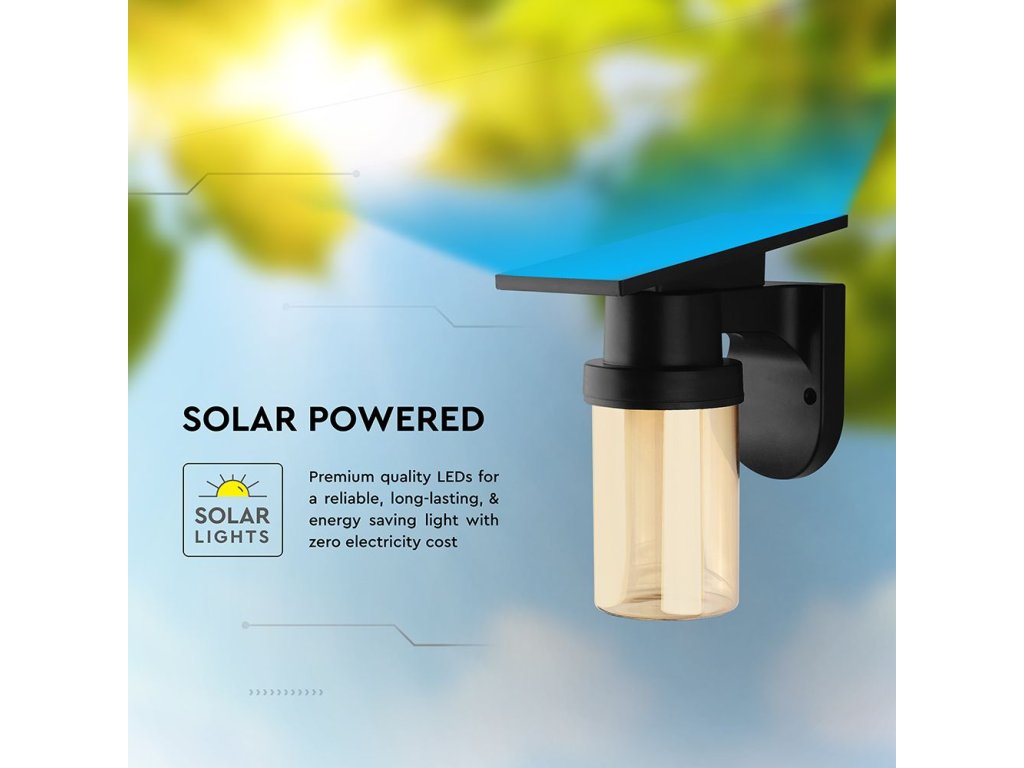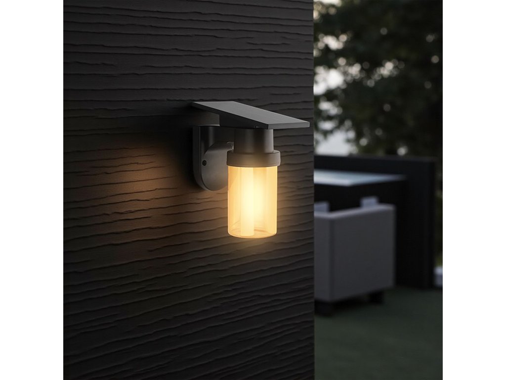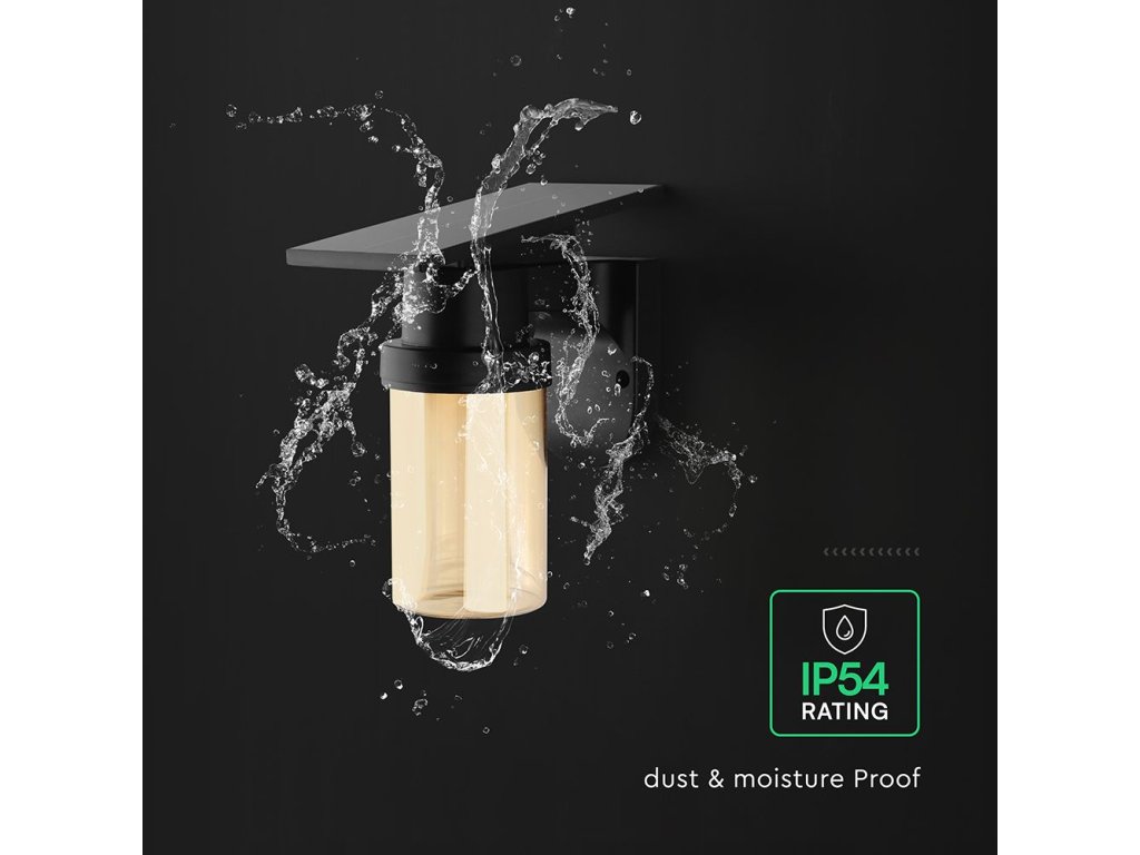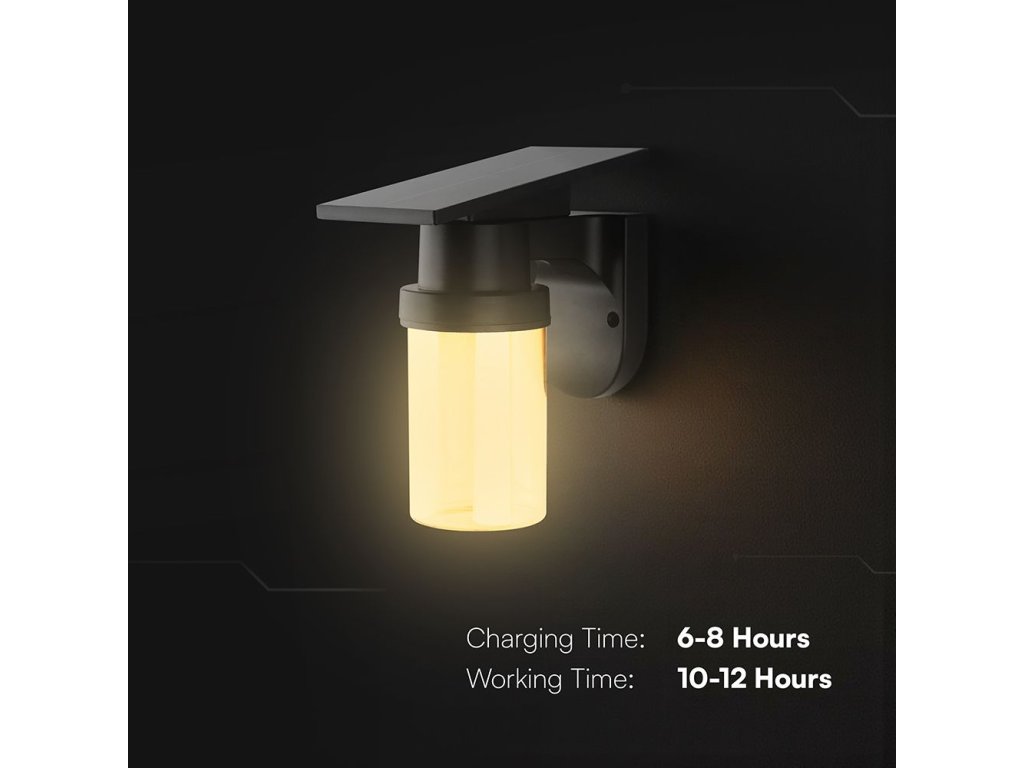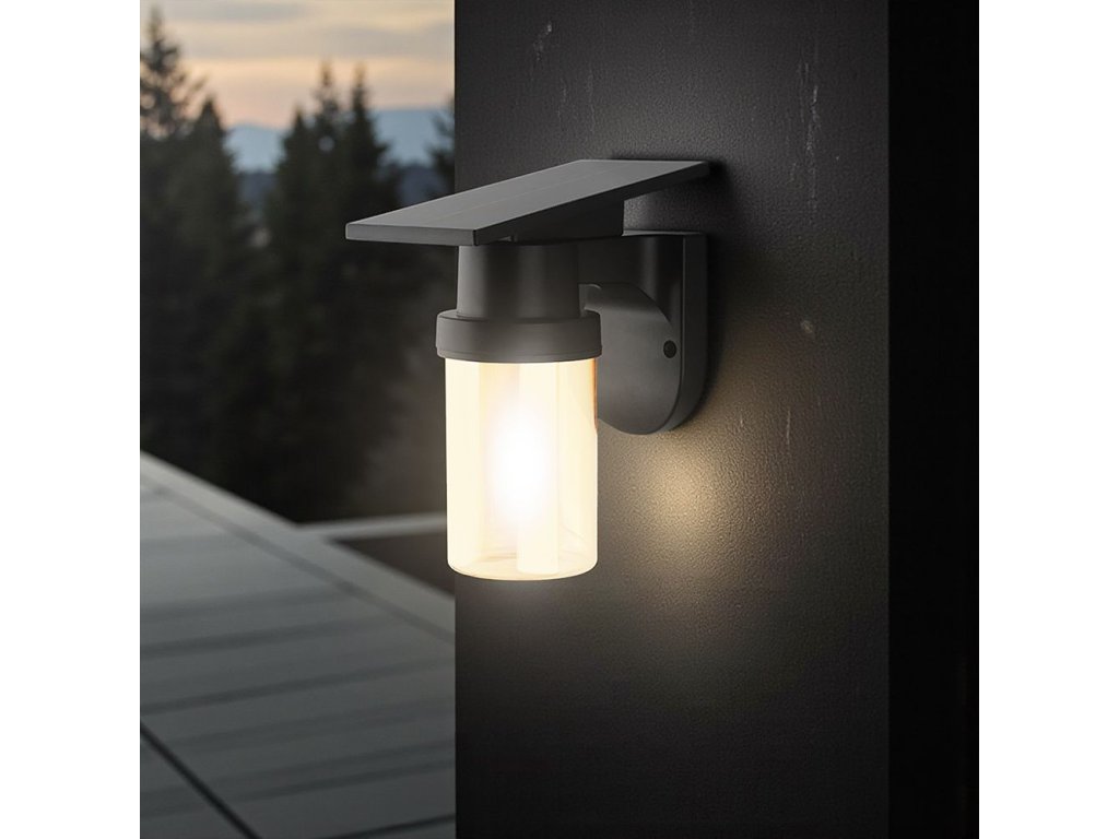 Fekete napelemes LED homlokzati lámpa henger alakú diffúzorral elegáns és modern kültéri világítási megoldást kínál, amely nem igényel kábelezést. Monokristályos napelem DC 5 V / 2,3 W tölti a beépített Li-Ion akkumulátort 3,7 V 1800 mAh kapacitással napközben. A fényviszonyoktól függően a töltés körülbelül 6-8 órát vesz igénybe, ezután a lámpa 10-12 órán keresztül képes világítani. A működés tehát teljesen autonóm, és a szokásos kültéri körülményekhez igazodik.