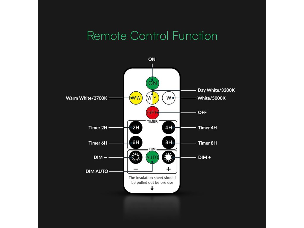 A csomag tartalmaz egy távirányítót, amely lehetővé teszi a be- és kikapcsolás kényelmes vezérlését, valamint a fényhőmérséklet és a fényerő beállítását. Választható meleg (2700K), semleges (3200K) és hideg fehér (5000K) színben, így a fényt könnyen hozzáigazíthatja az aktuális hangulathoz vagy a tér jellegéhez. Rendelkezésre áll továbbá a szabályozható fényerő funkció, egy 2, 4, 6 vagy 8 órás időzítő, valamint egy automatikus üzemmód, amelyben a lámpa szükség szerint maga szabályozza a fényerőt. A beépített alkonykapcsoló funkció biztosítja, hogy a lámpa éjszaka magától bekapcsoljon, és hajnalban ismét kikapcsoljon, ha a fizikai kapcsoló ON állásban van.