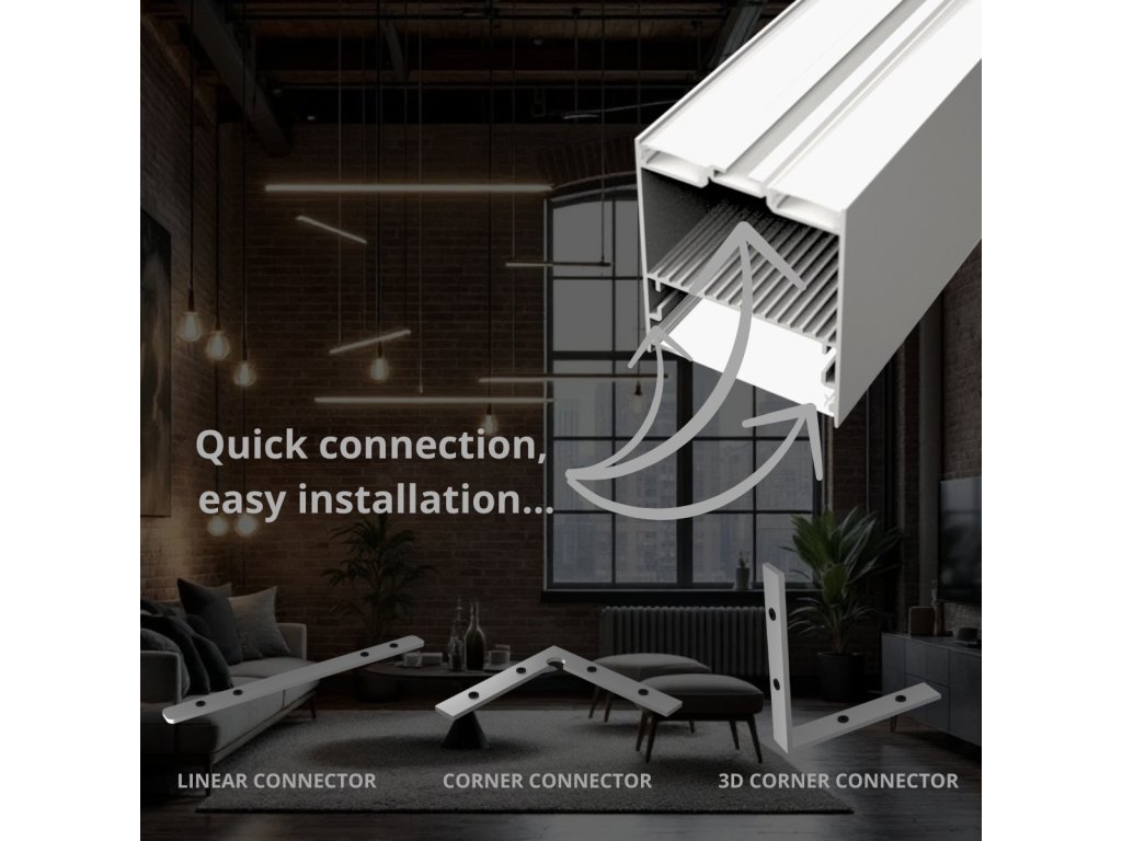Ez a függesztett alumínium profil univerzális megoldás a modern belső terekhez. Használható függesztett, felületre szerelt és gipszkarton szereléshez, és a közvetlen és közvetett világítás kombinációját kínálja. A tágas üregnek köszönhetően a tápegység és a fényerőszabályzó közvetlenül a profilba rejthető, ami tiszta és minimalista telepítést biztosít.