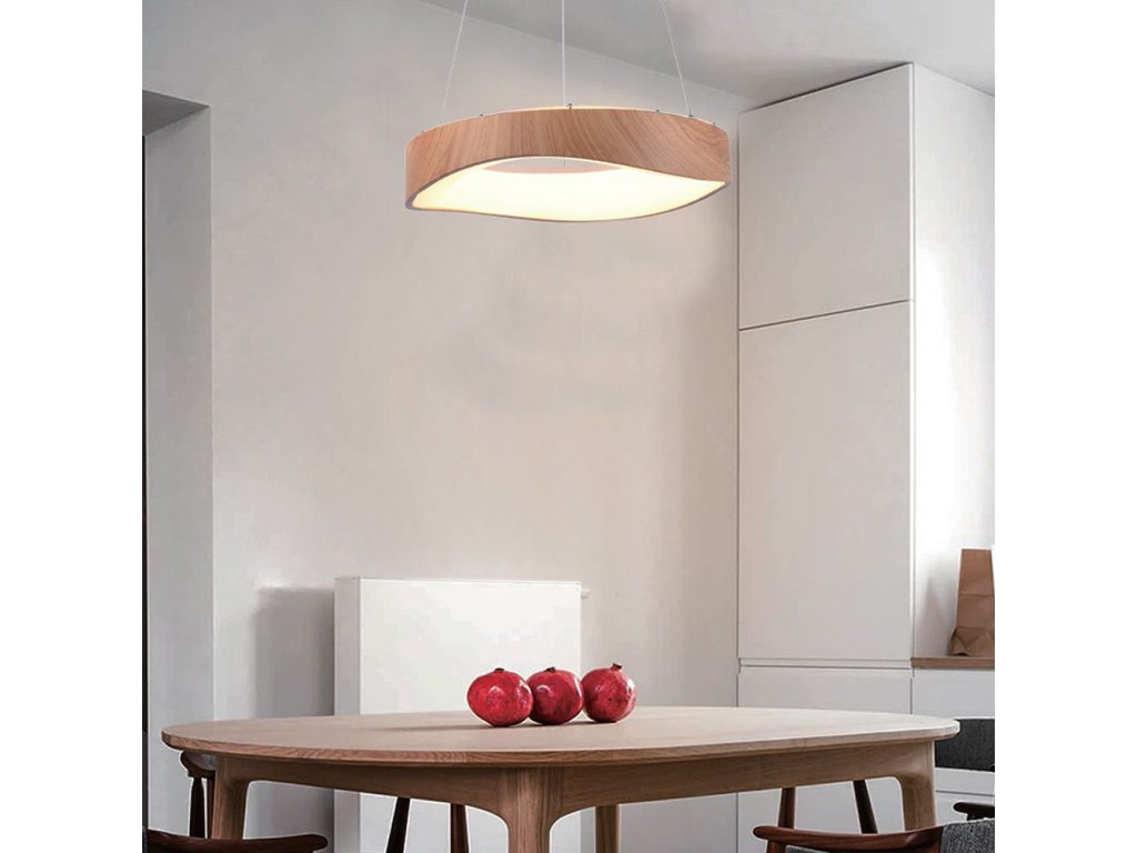 Designer LED mennyezeti lámpa fadíszítéssel, 18W. A régebbi, E27-es izzókhoz való lámpatesteket helyettesíti. A LED-es lámpatest átmérője 400 mm, teljes magassága 1400 mm. Ez egy olyan lámpatest, amelynek kialakítása alkalmas szállodák, lakóházak, éttermek és kereskedelmi helyiségek számára. A lámpatest fából készült, acélkábelekre felfüggesztve. Az egyes diódák, amelyek a tejszerű műanyag csíkok alatt vannak elhelyezve, nem vakítanak, és nem látszanak a lámpatestben. Ezért megkülönböztethetetlenek a hagyományos lámpatestektől. Az állítható magasságnak köszönhetően a lámpatest különböző típusú belső terekhez igazítható.