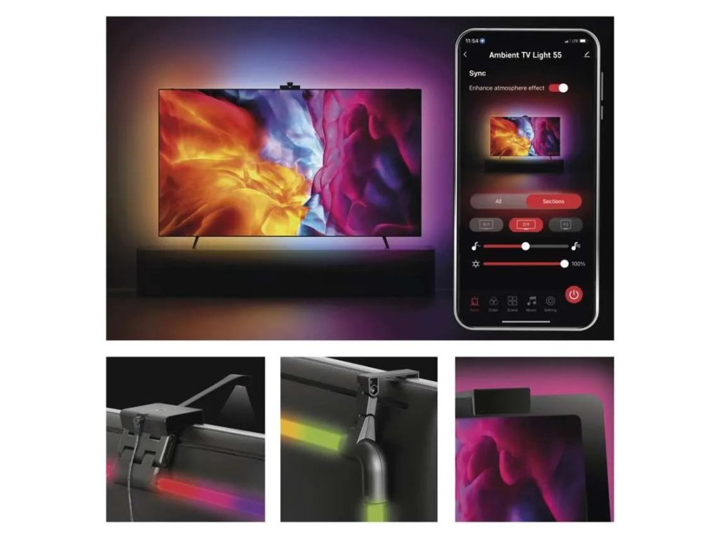 GoSmart Ambient LED RGB világítás TV mögé új dimenziót kölcsönöz a televíziózásnak, és magával ragadó vizuális élményt teremt. A HD szinkronizációs kamerának köszönhetően a háttérvilágítás automatikusan igazodik a képernyő színeihez, így a kép optikailag kiszélesedik, és mélyebb vizuális hatást kelt. Ez az effekt nemcsak a filmek vagy játékok nézése közbeni hangulatot javítja, hanem csökkenti a szem fáradtságát is.