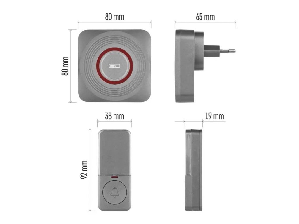 | Méretek | 19 x 38 x 92 mm (nyomógomb), 80 x 80 x 65 mm (csengő) |